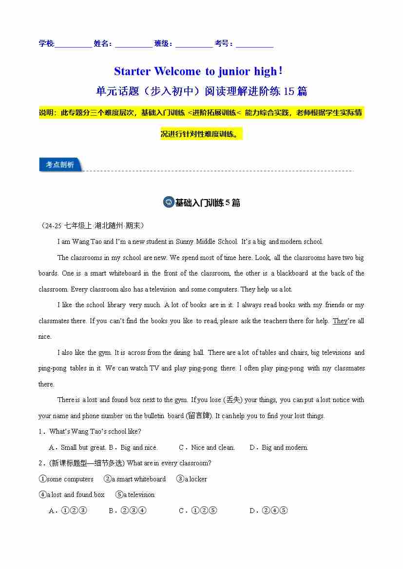 Starter Welcome to junior high!单元话题(步入初中)阅读理解进阶练15篇(学生版)