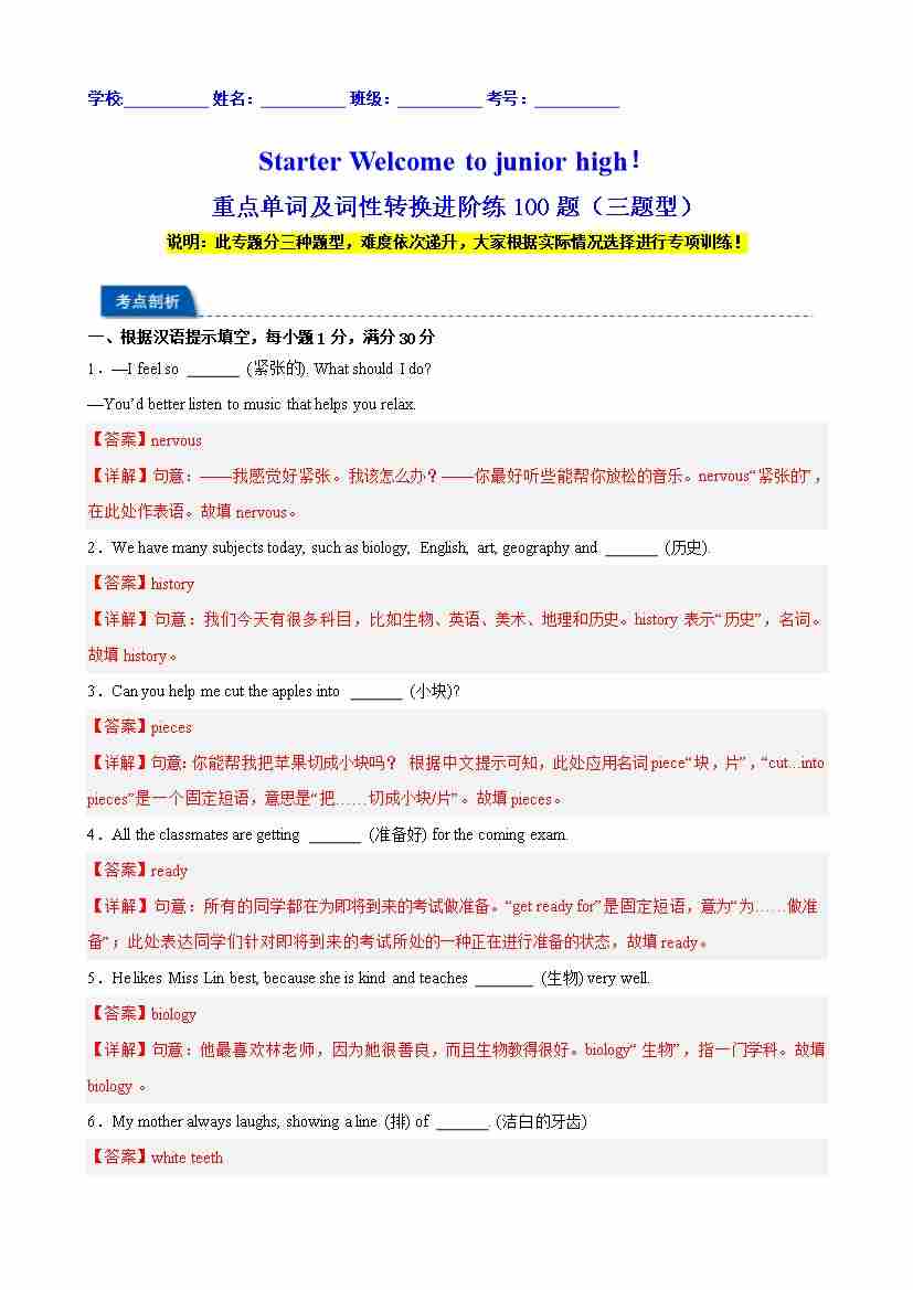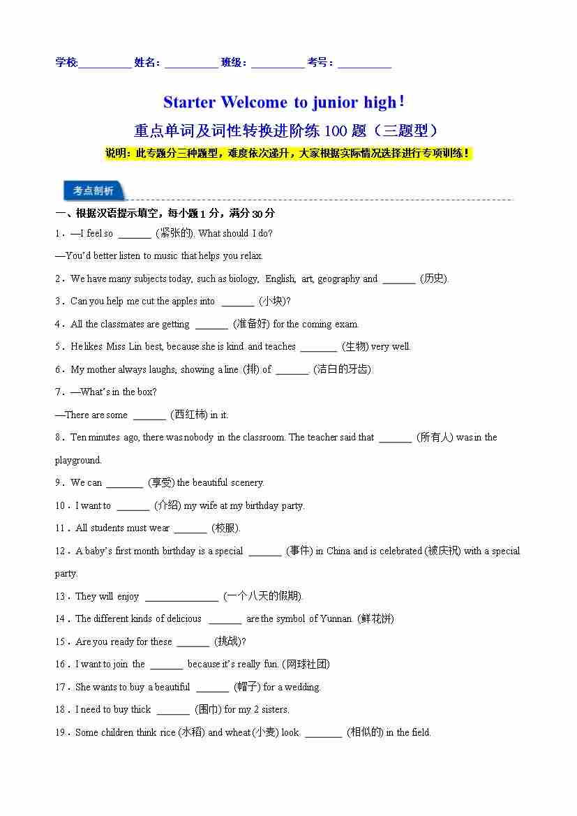 Starter Welcome to junior high!重点单词及词性转换进阶练100题(三题型)(教师版)