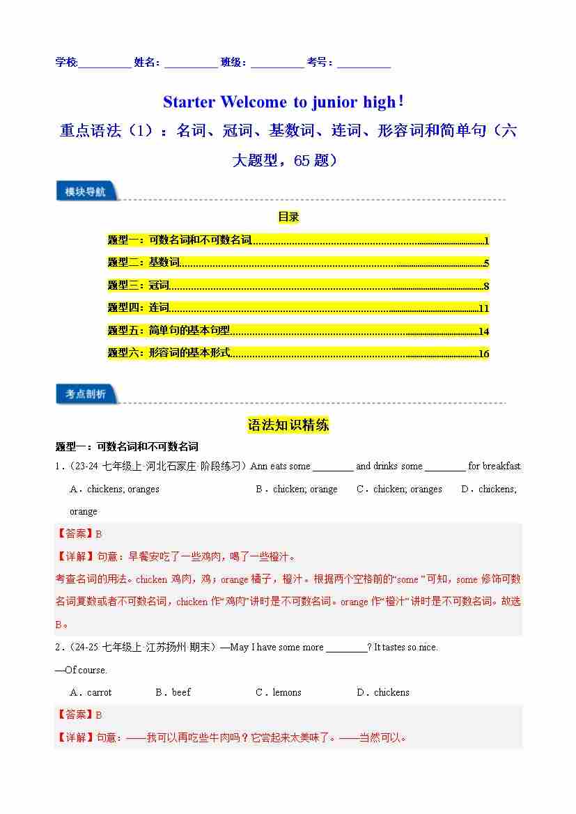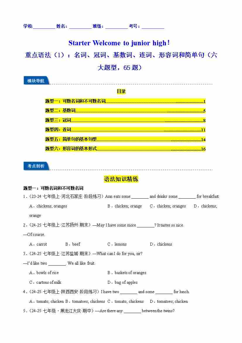 Starter Welcome to junior high!重点语法(1):名词、冠词、基数词、连词、形容词和简单句(六大题型,65题)(教师版)