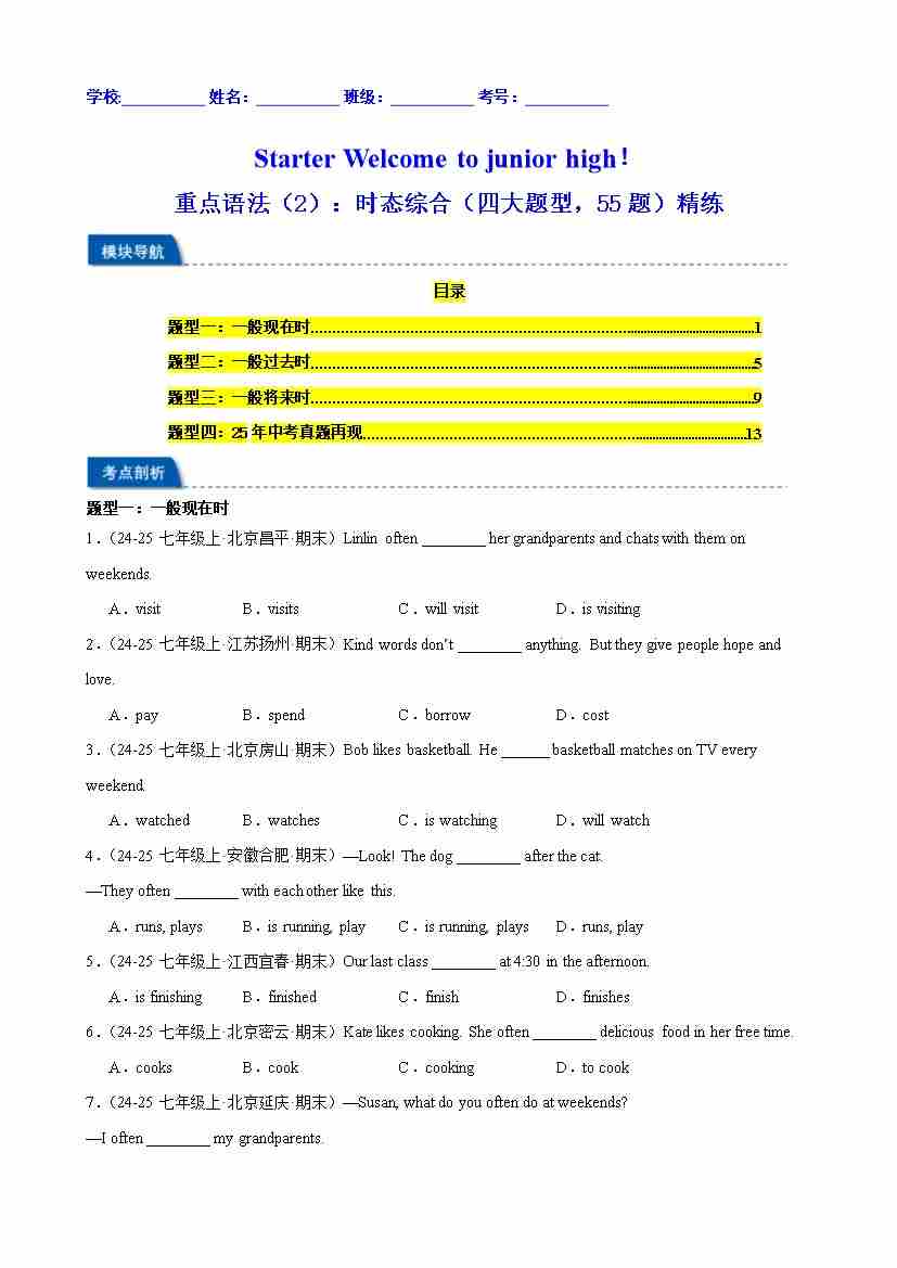 Starter Welcome to junior high!重点语法(2):时态综合(四大题型,55题)(学生版)