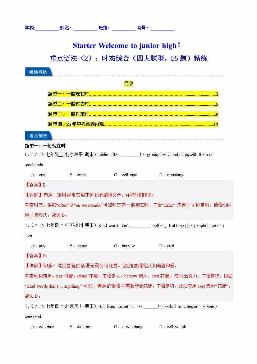 Starter Welcome to junior high!重点语法(2):时态综合(四大题型,55题)(教师版)