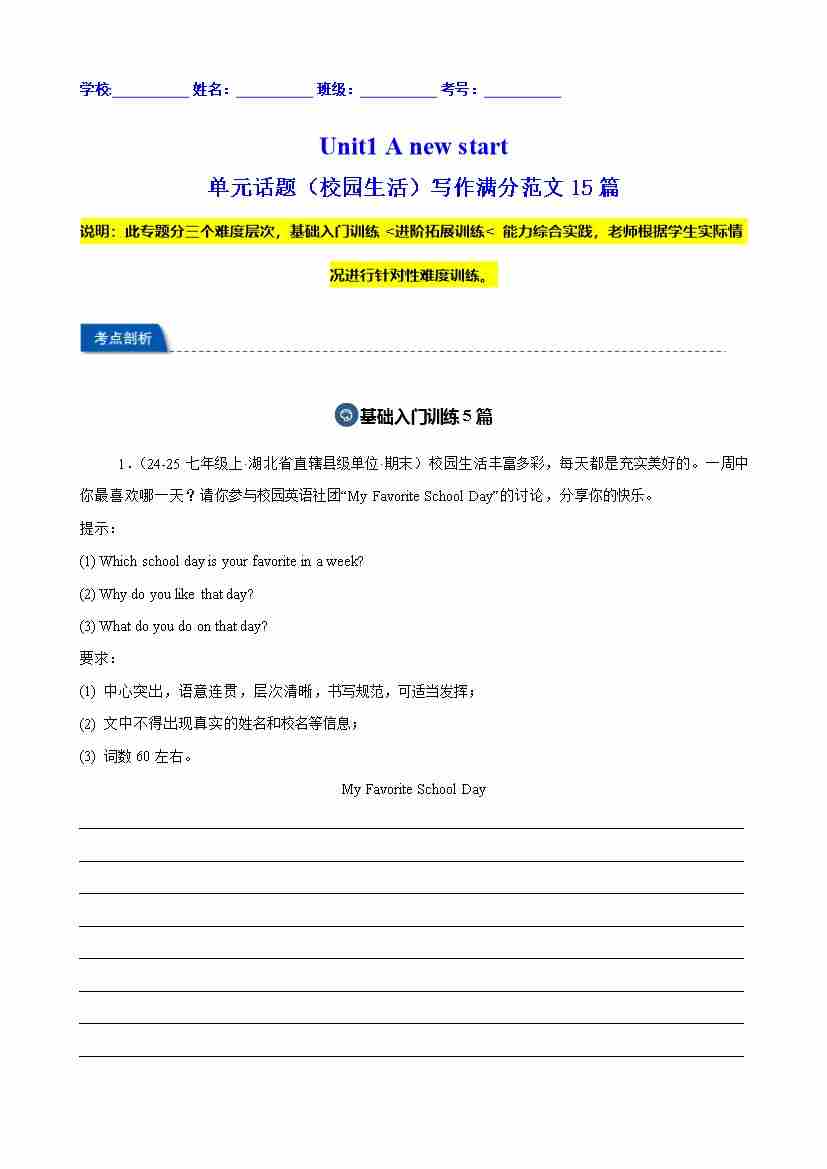 Unit1 A new start 单元话题(校园生活)写作满分范文15篇(教师版)