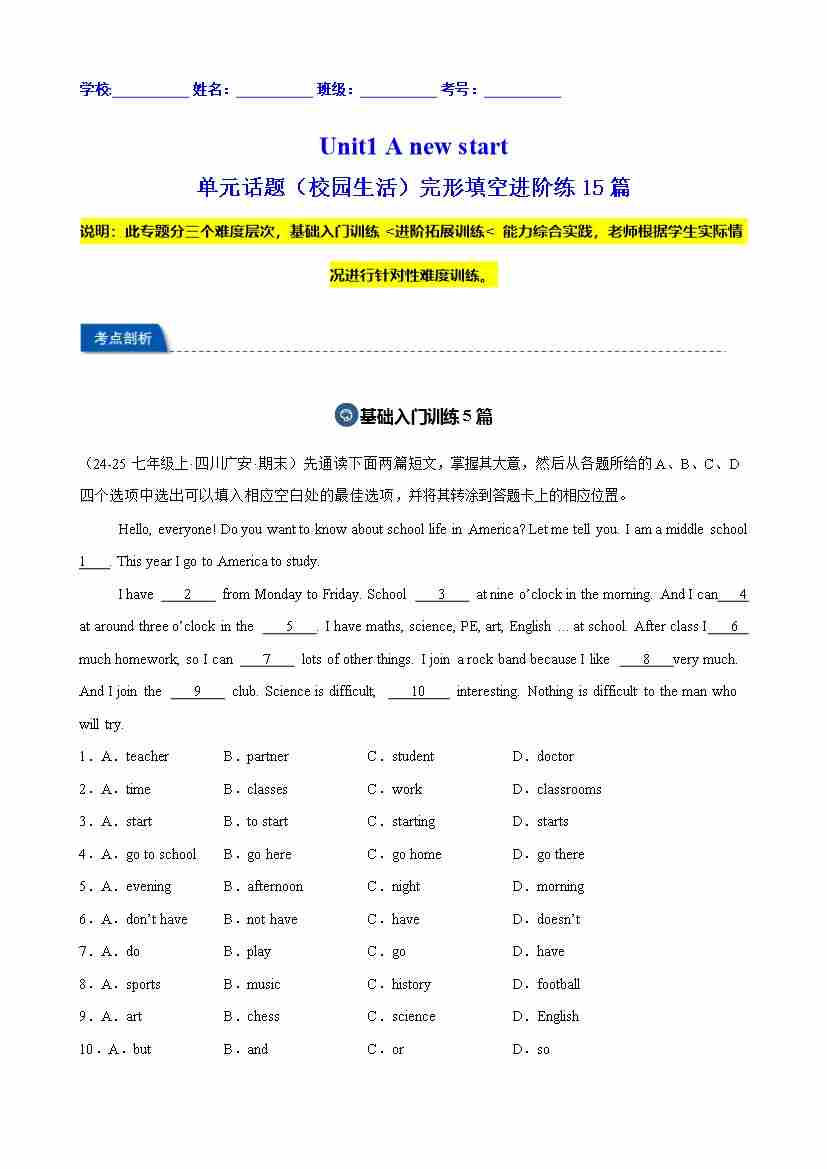 Unit1 A new start 单元话题(校园生活)完形填空进阶练15篇(学生版)