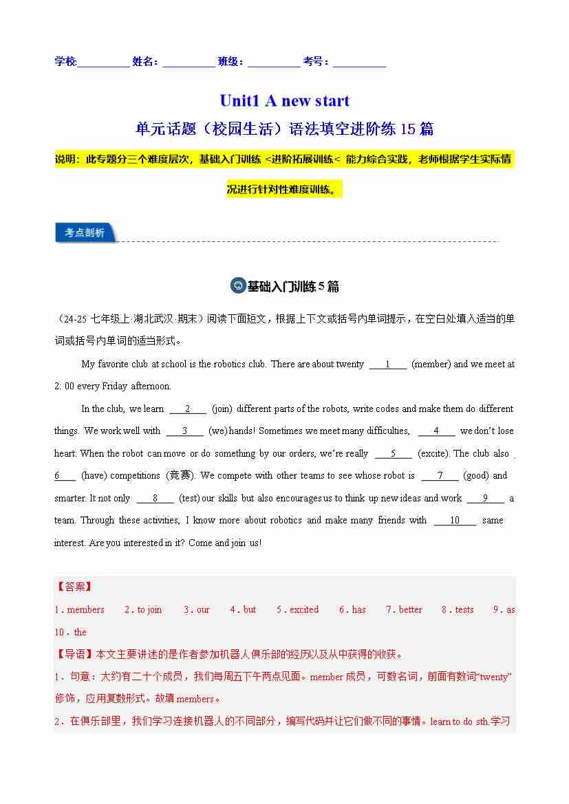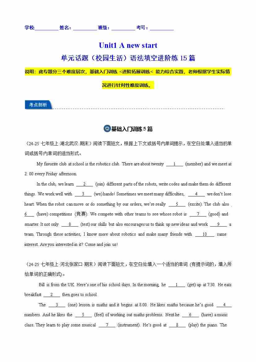 Unit1 A new start 单元话题(校园生活)语法填空进阶练15篇(学生版)