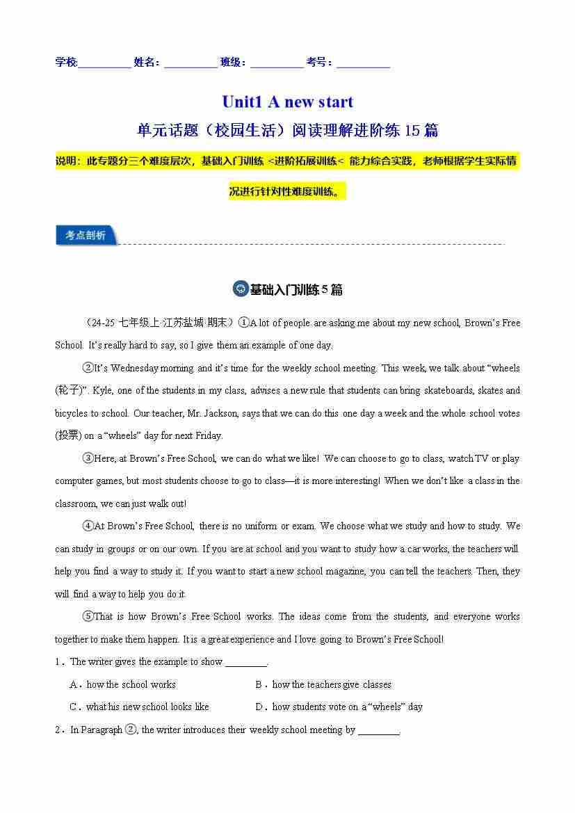 Unit1 A new start 单元话题(校园生活)阅读理解进阶练15篇(学生版)