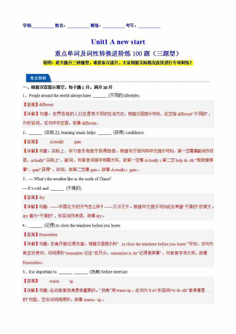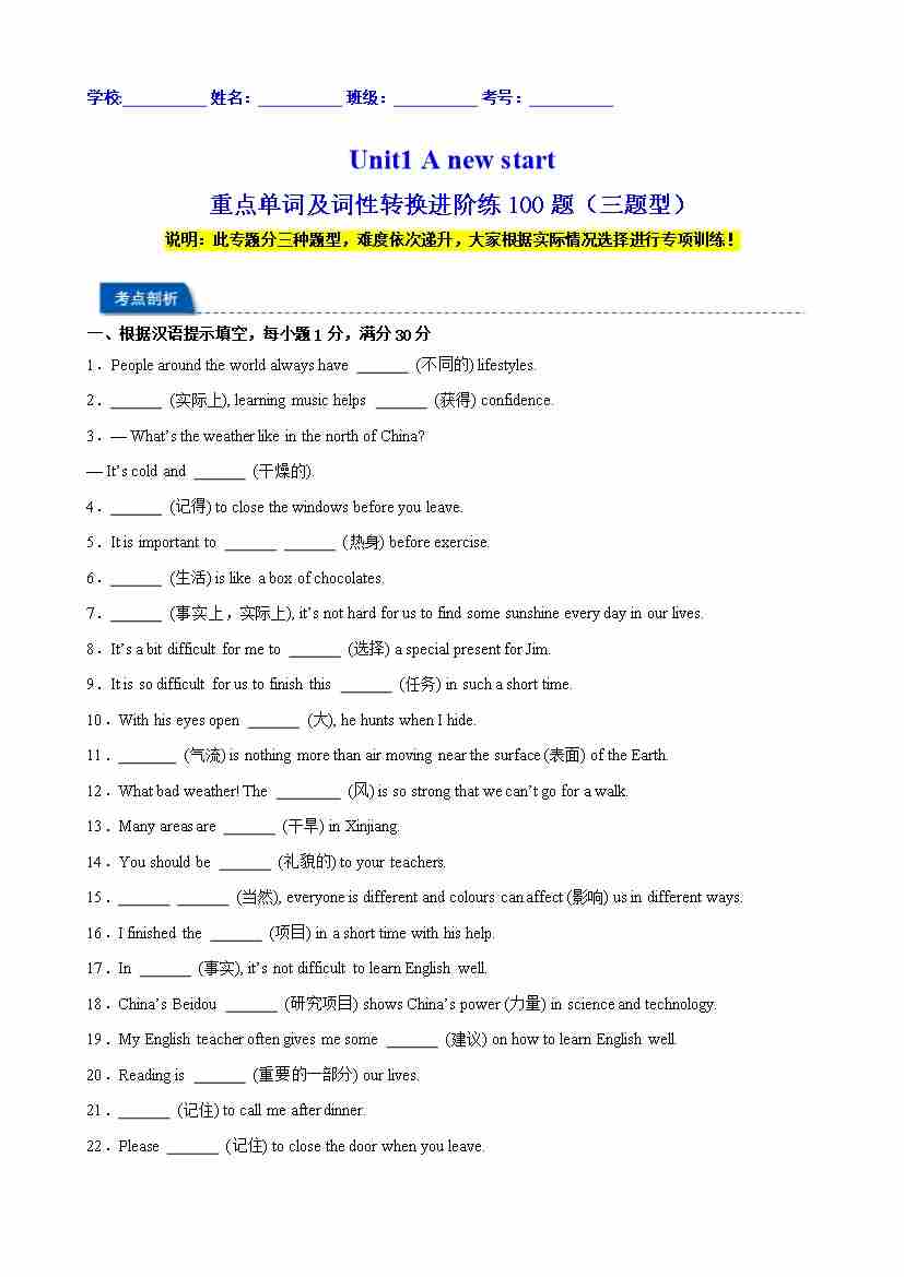 Unit1 A new start 重点单词及词性转换进阶练100题(三题型)(教师版)