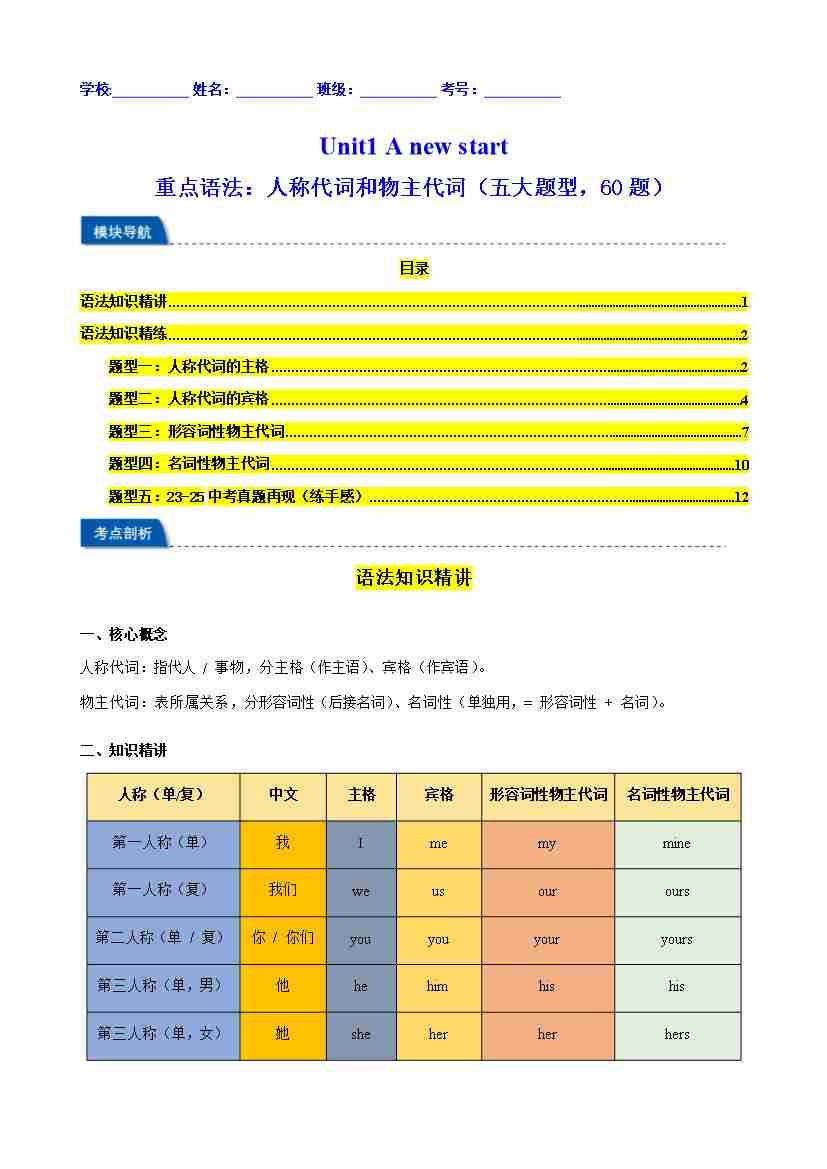 Unit1 A new start 重点语法:人称代词和物主代词(五大题型,60题)(学生版)