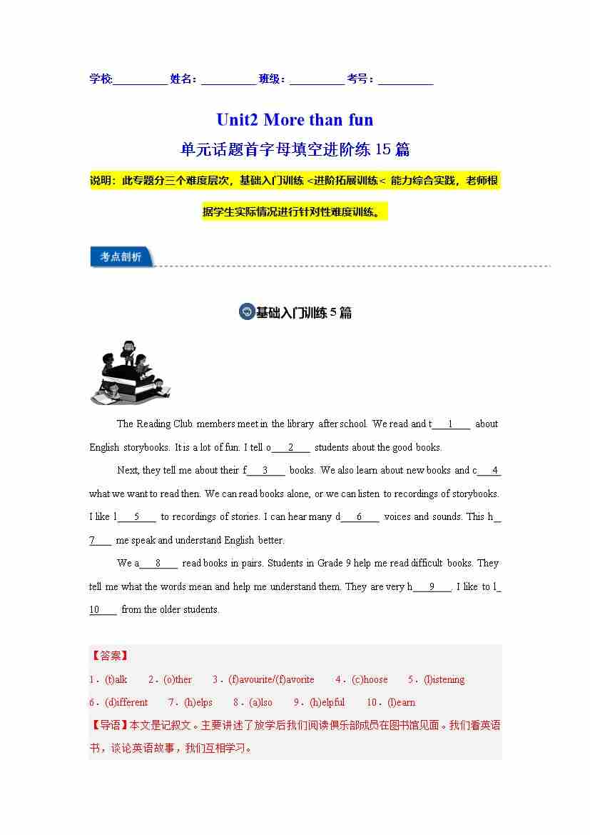 Unit2 More than fun 单元话题首字母填空进阶练15篇(教师版)