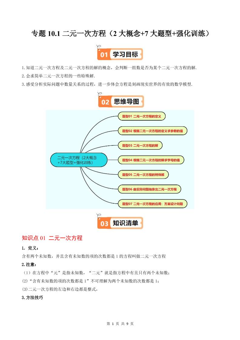 专题10.1二元一次方程(2大概念、7大题型、强化训练)(原卷版)