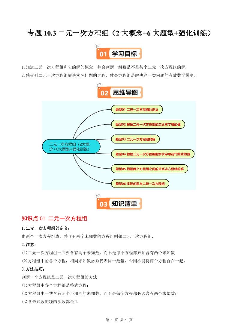 专题10.2二元一次方程组(2大概念、6大题型、强化训练)(原卷版)