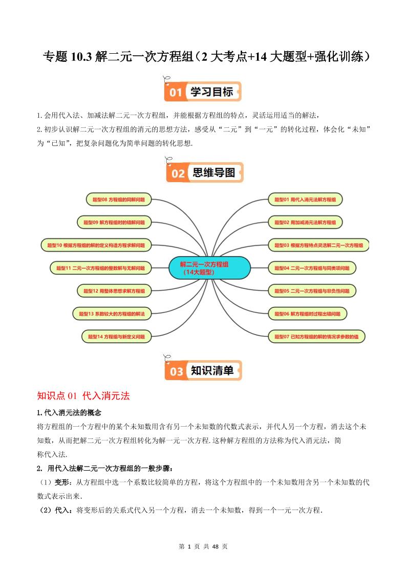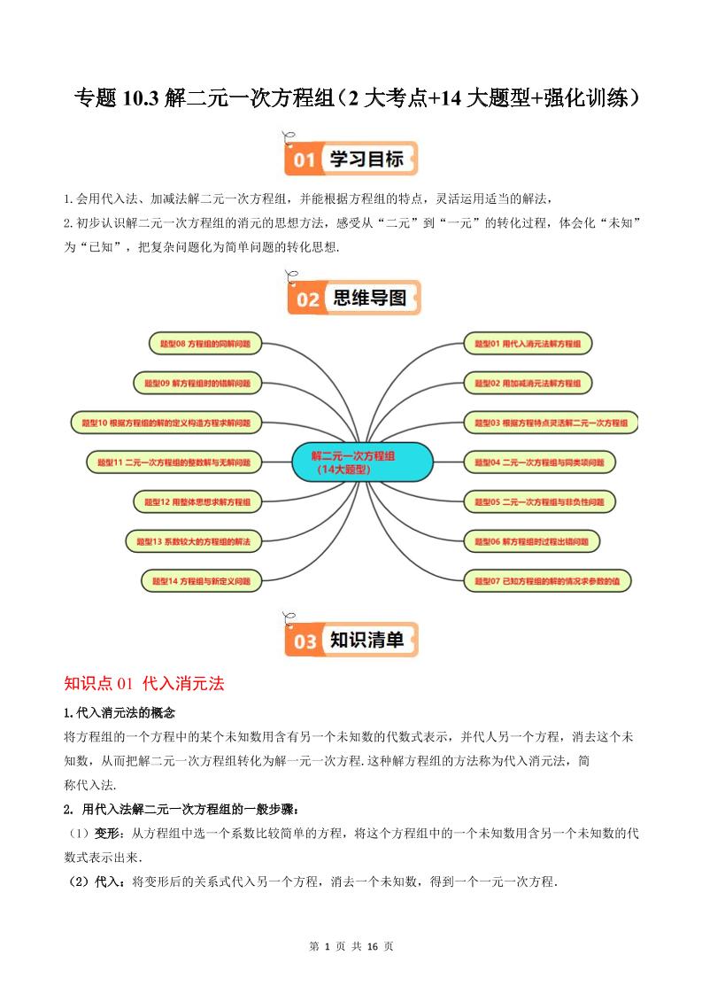 专题10.3解二元一次方程组(2大考点、14大题型、强化训练)(原卷版)
