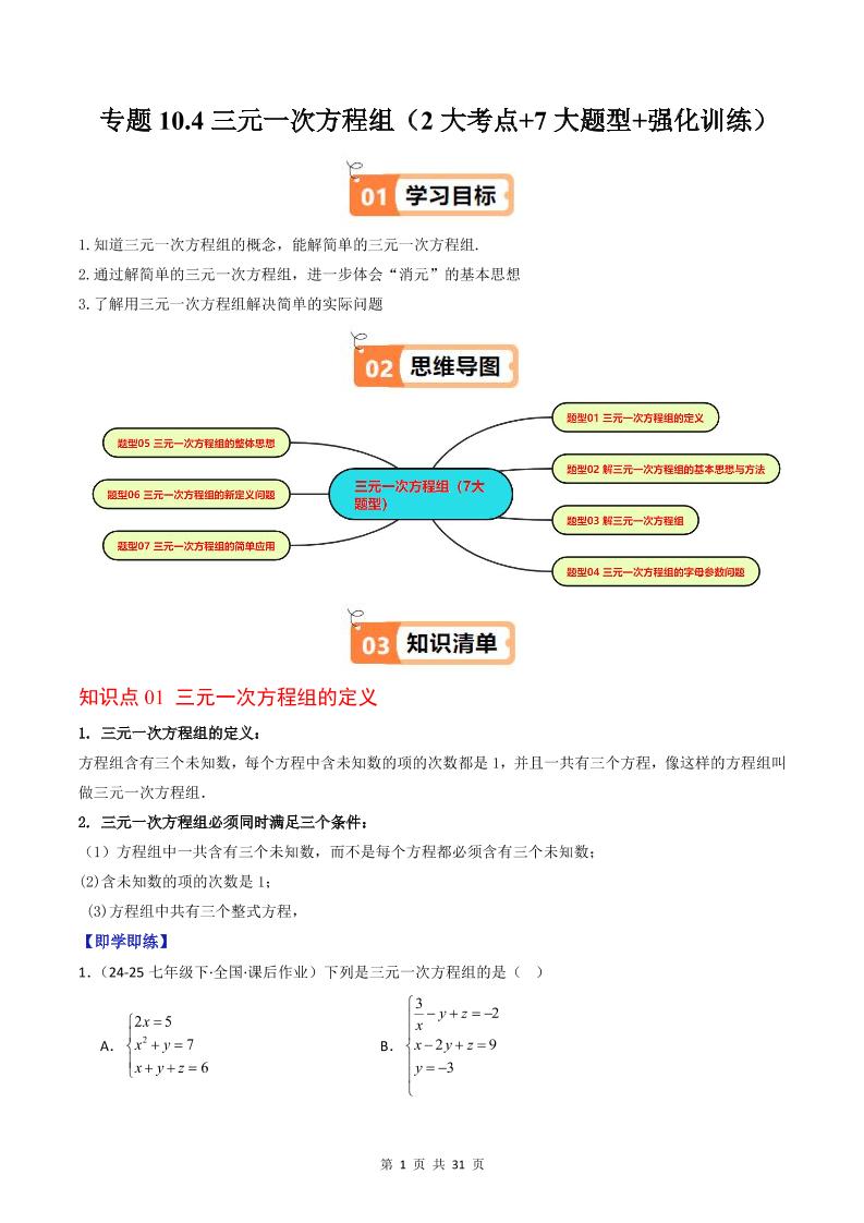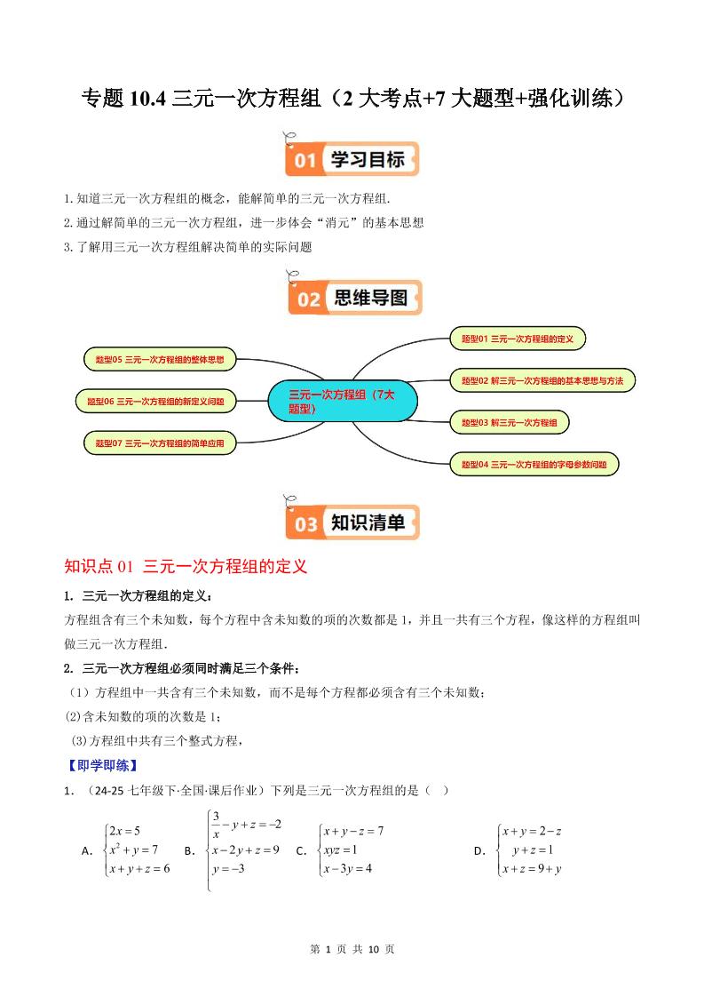 专题10.4三元一次方程组(2大考点、7大题型、强化训练)(原卷版)