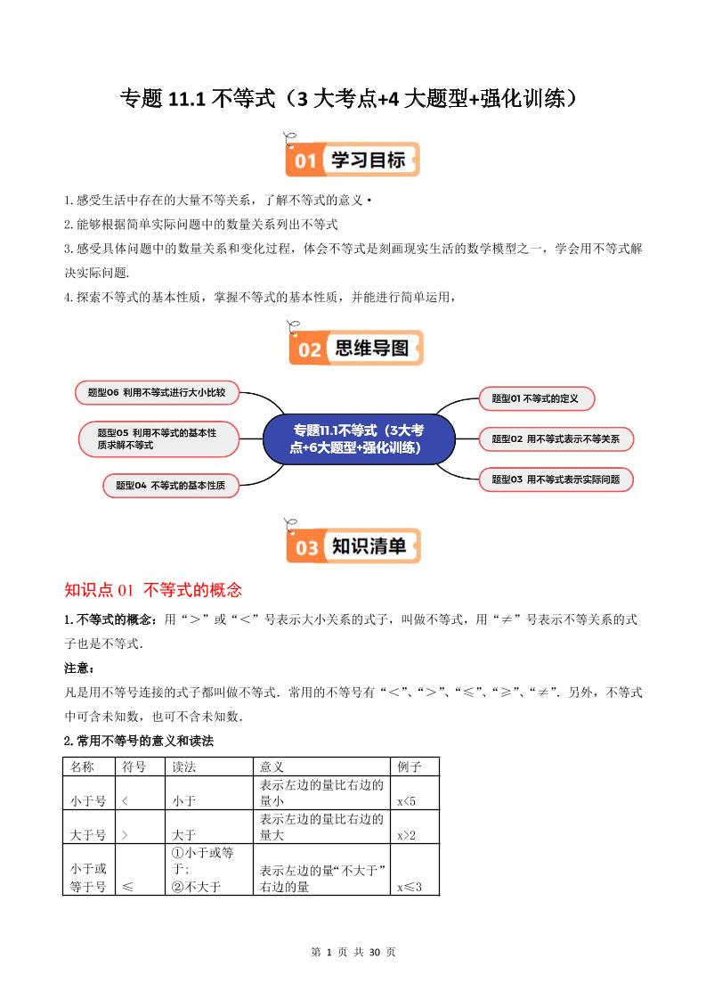 专题11.1不等式(3大考点、6大题型、强化训练)(解析版)