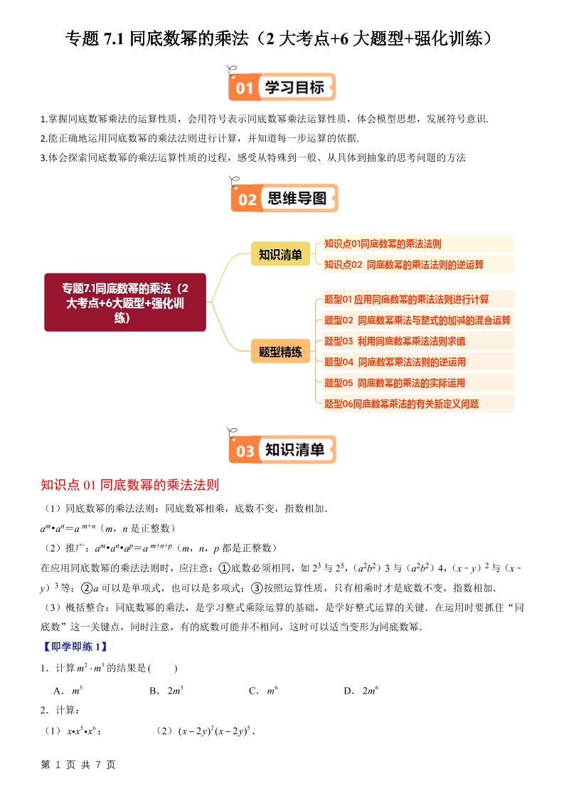 专题7.1同底数幂的乘法(2大考点、6大题型、强化训练)(原卷版)