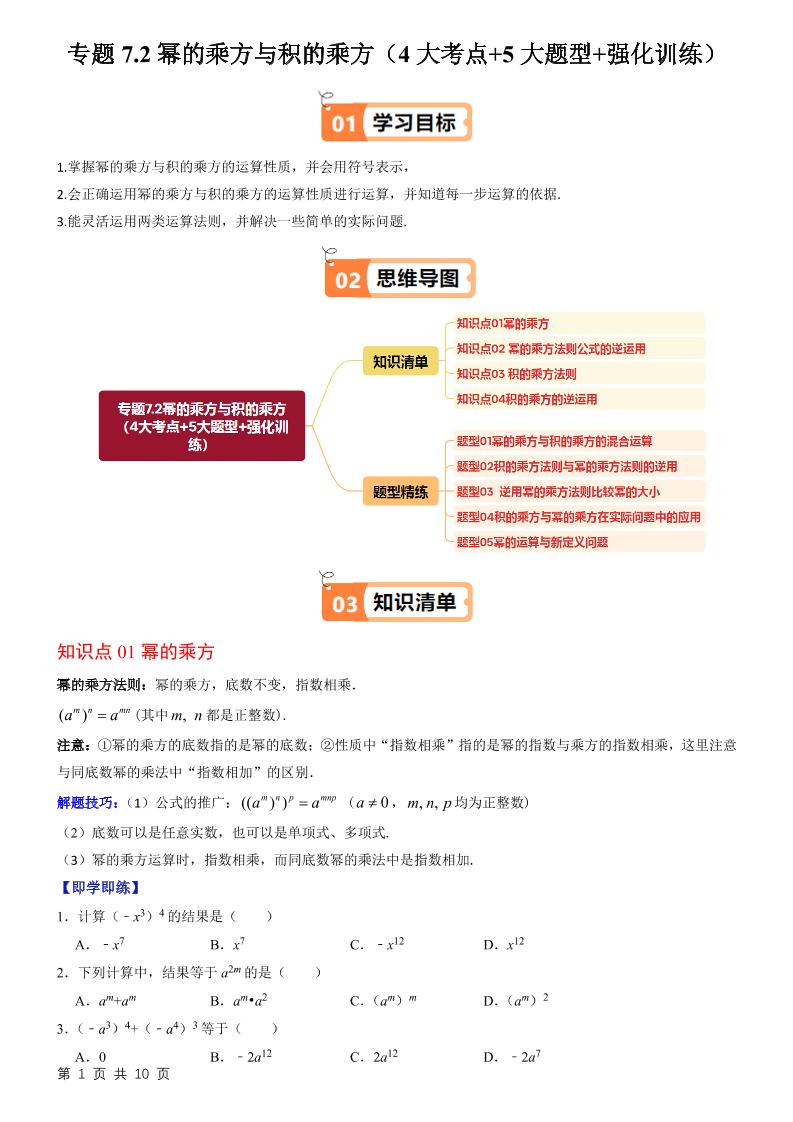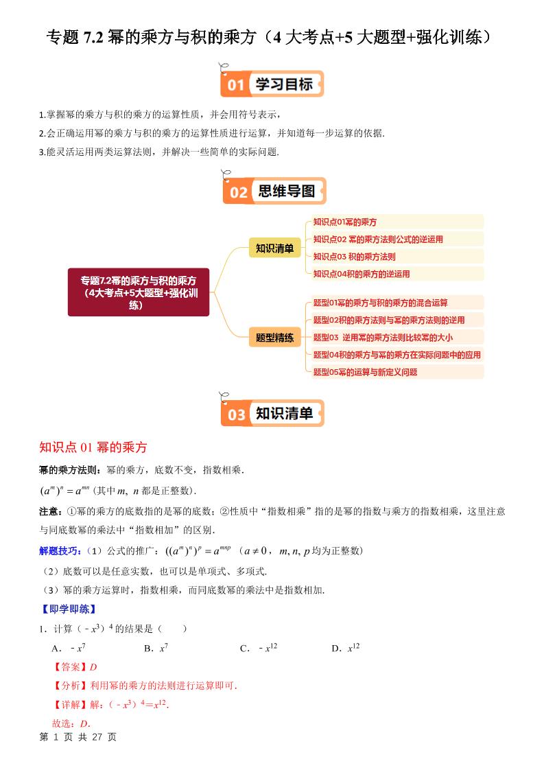 专题7.2幂的乘方与积的乘方(4大考点、5大题型、强化训练)(解析版)