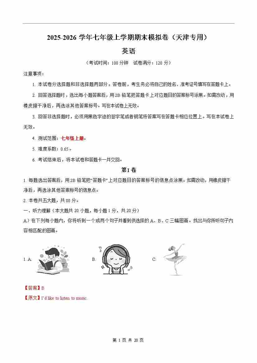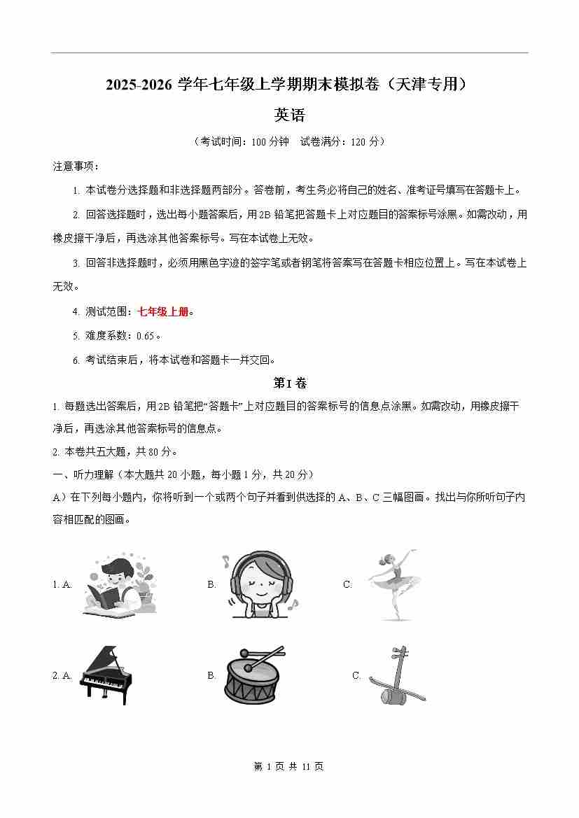七年级英语期末模拟卷(考试版A4)(天津专用)