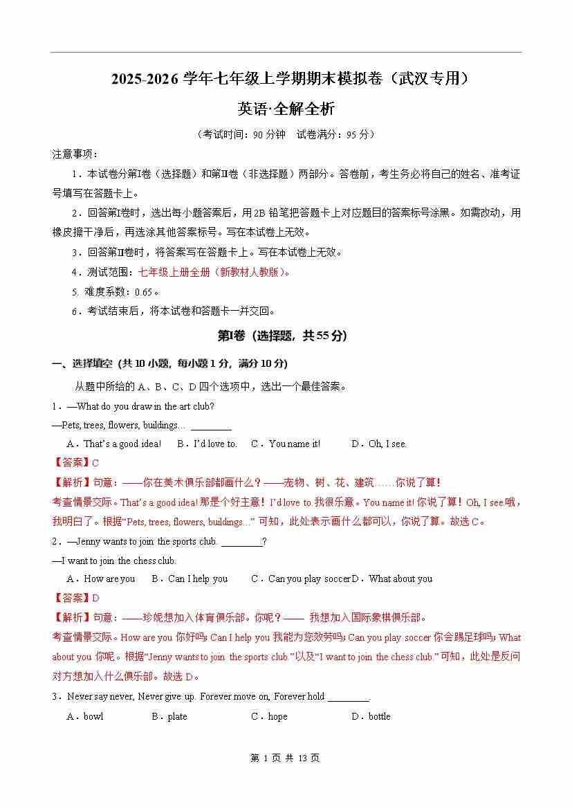 七年级英语期末模拟卷(全解全析)(武汉专用)