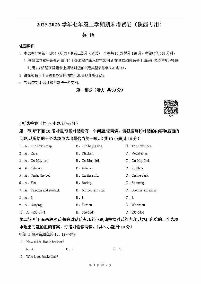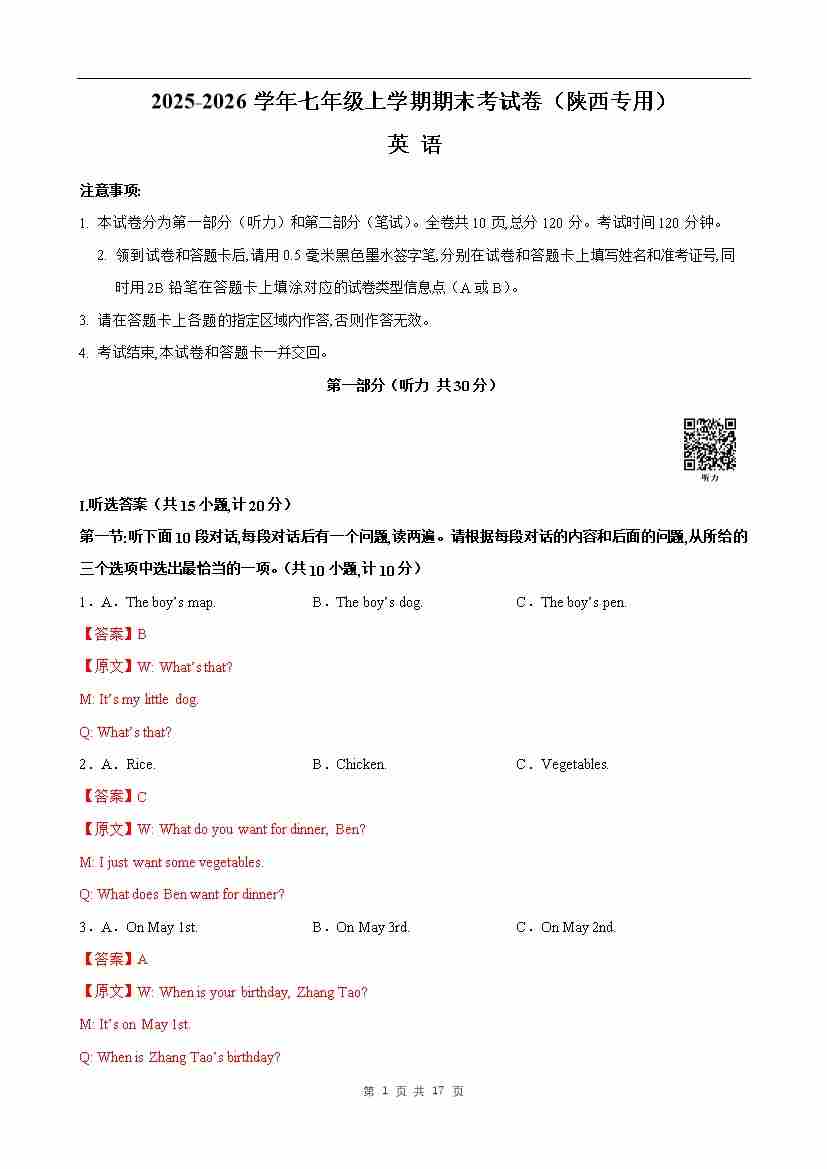 七年级英语期末模拟卷(考试版A4)(陕西专用)