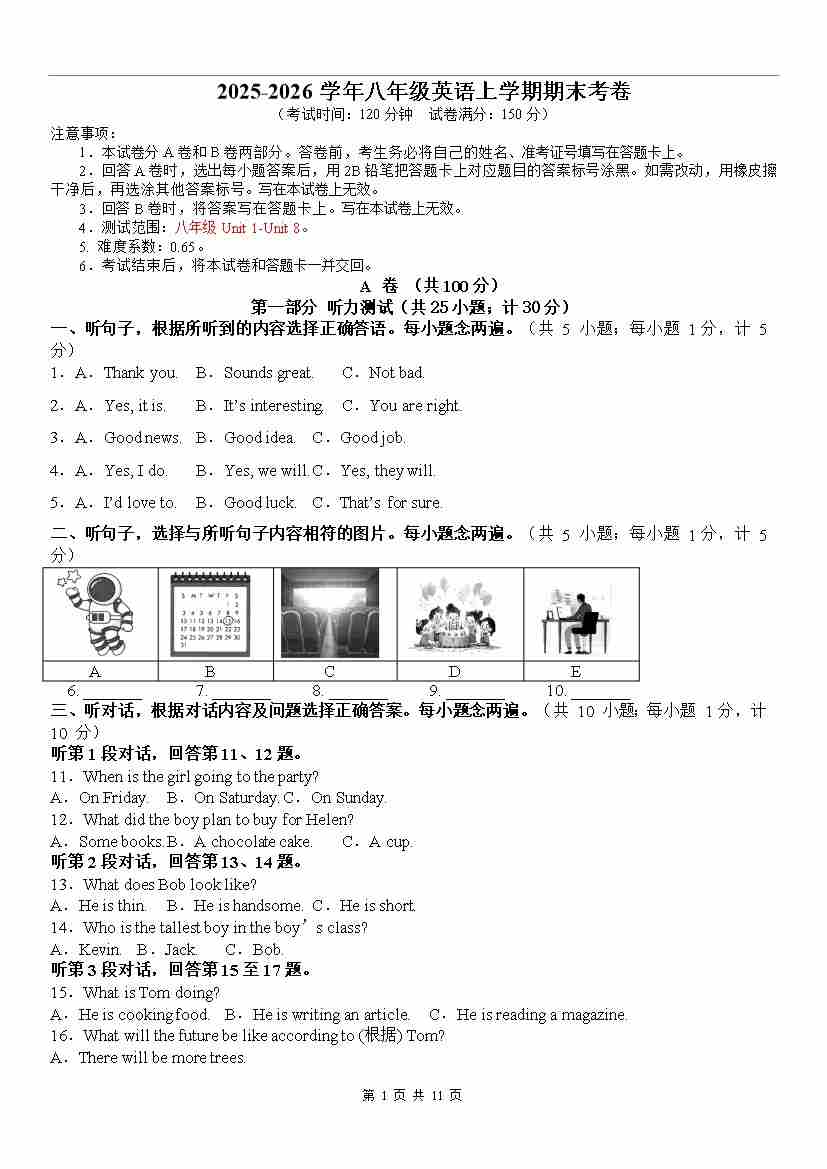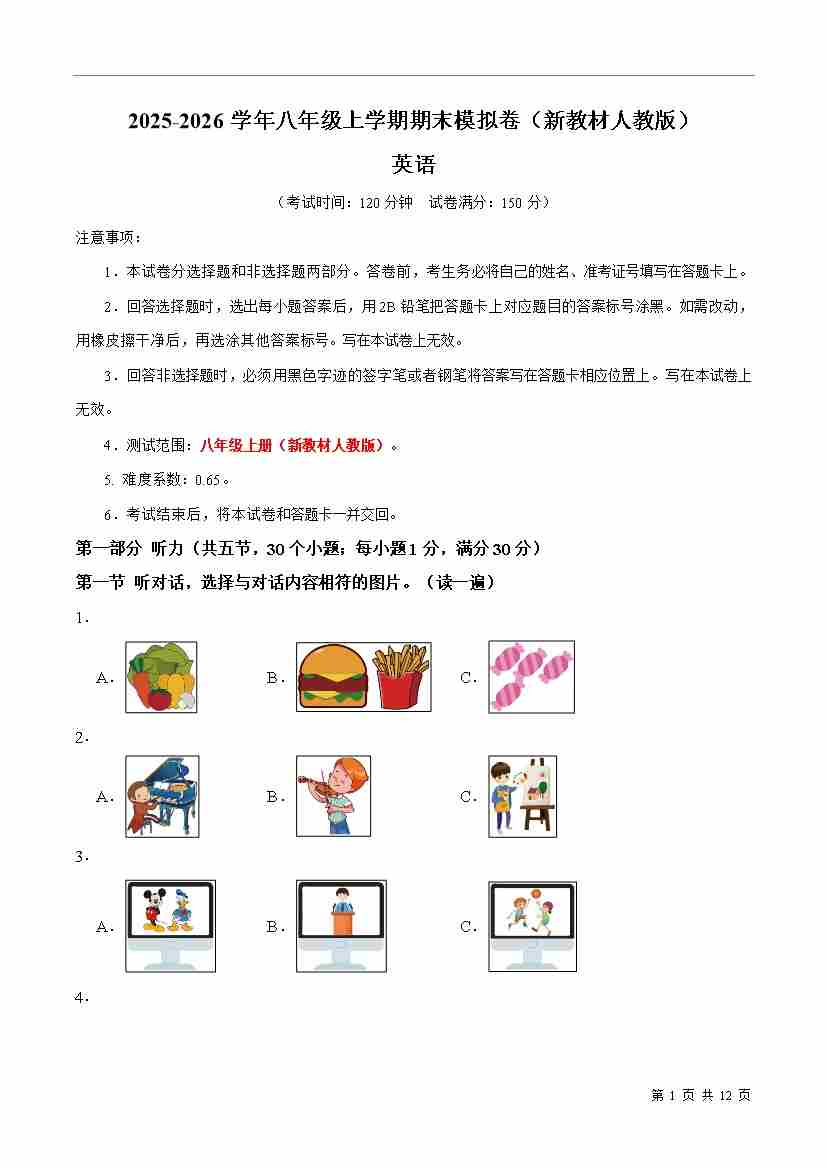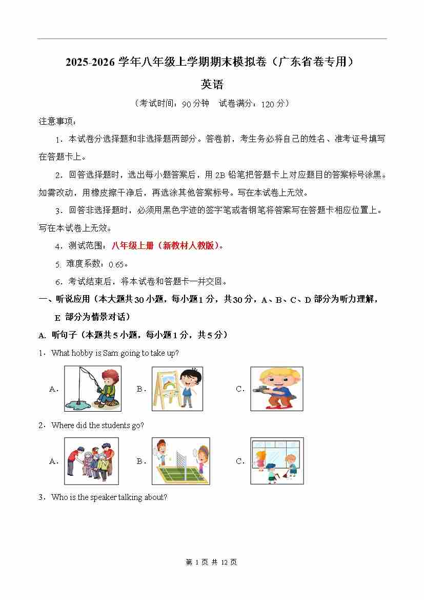 八年级上英语期末考卷(考试版A4)成都专用