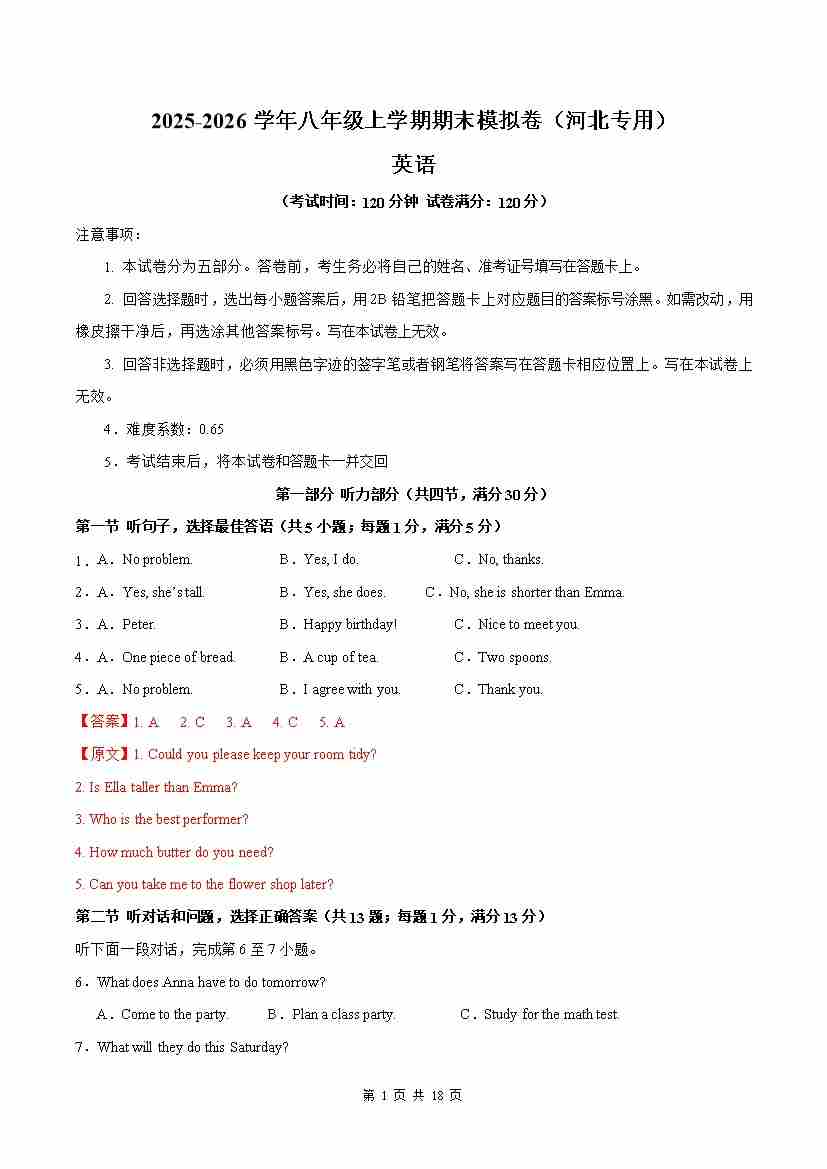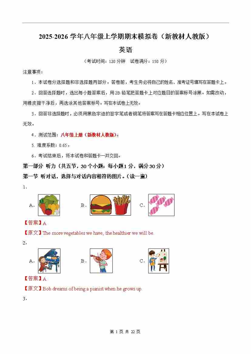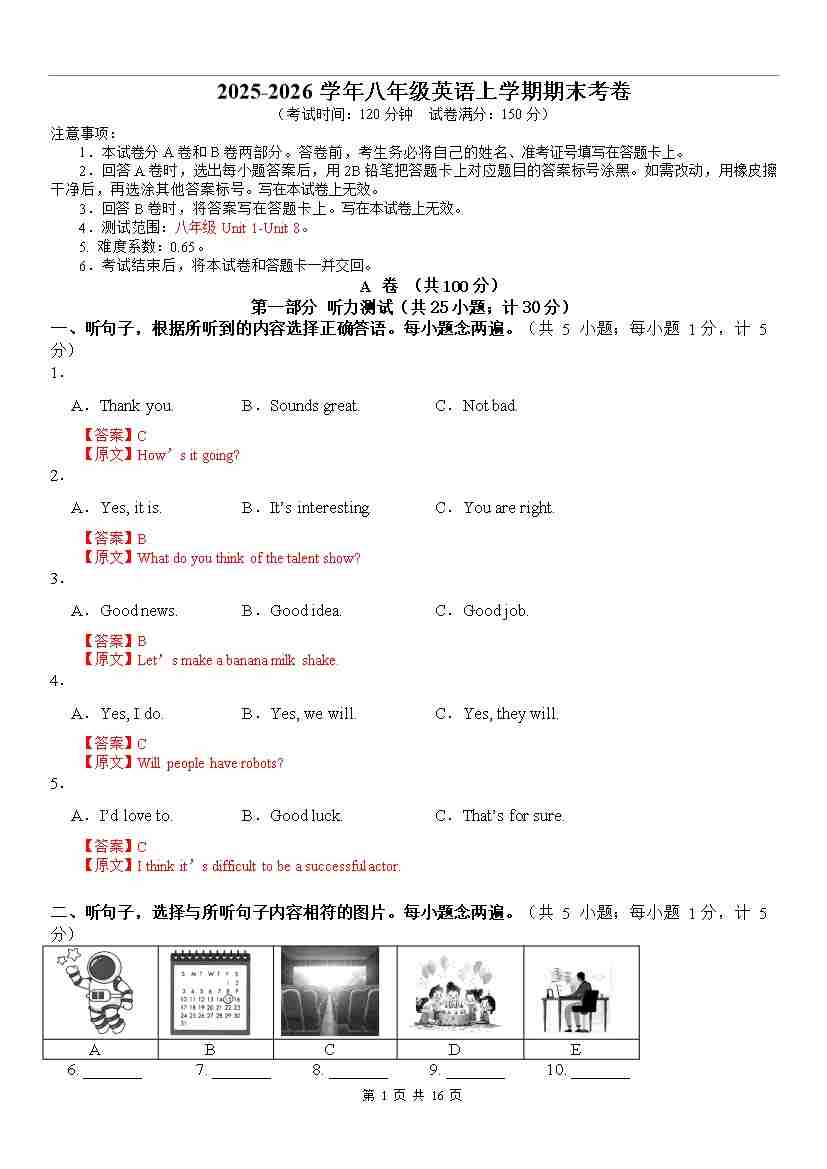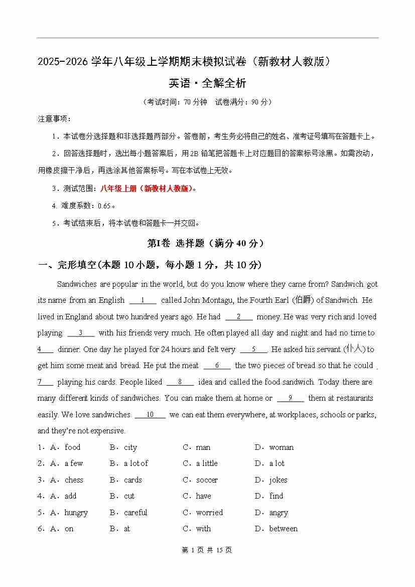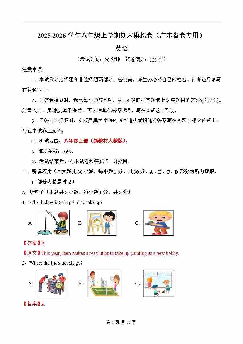 八年级上英语期末考卷(解析)成都专用