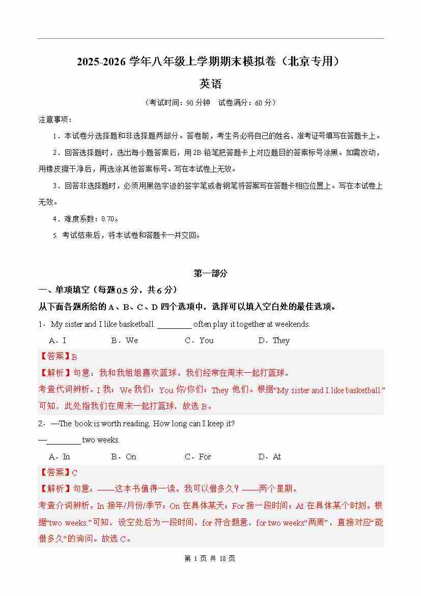 八年级英语期末模拟卷(全解全析)(北京专用)