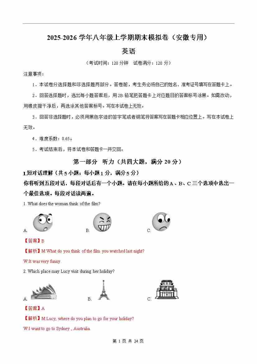 八年级英语期末模拟卷(全解全析)(安徽专用)