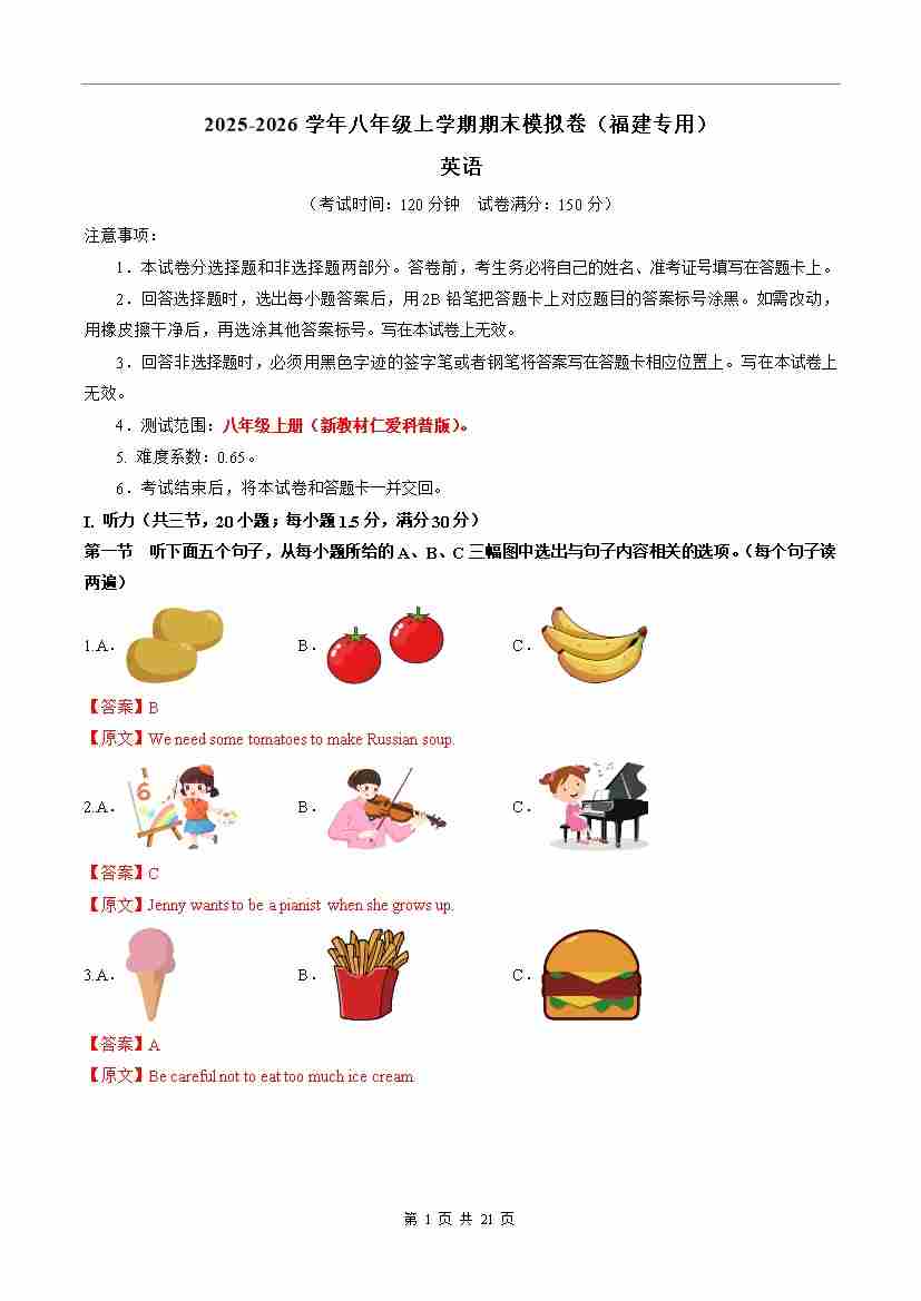 八年级英语期末模拟卷(全解全析)(福建专用)