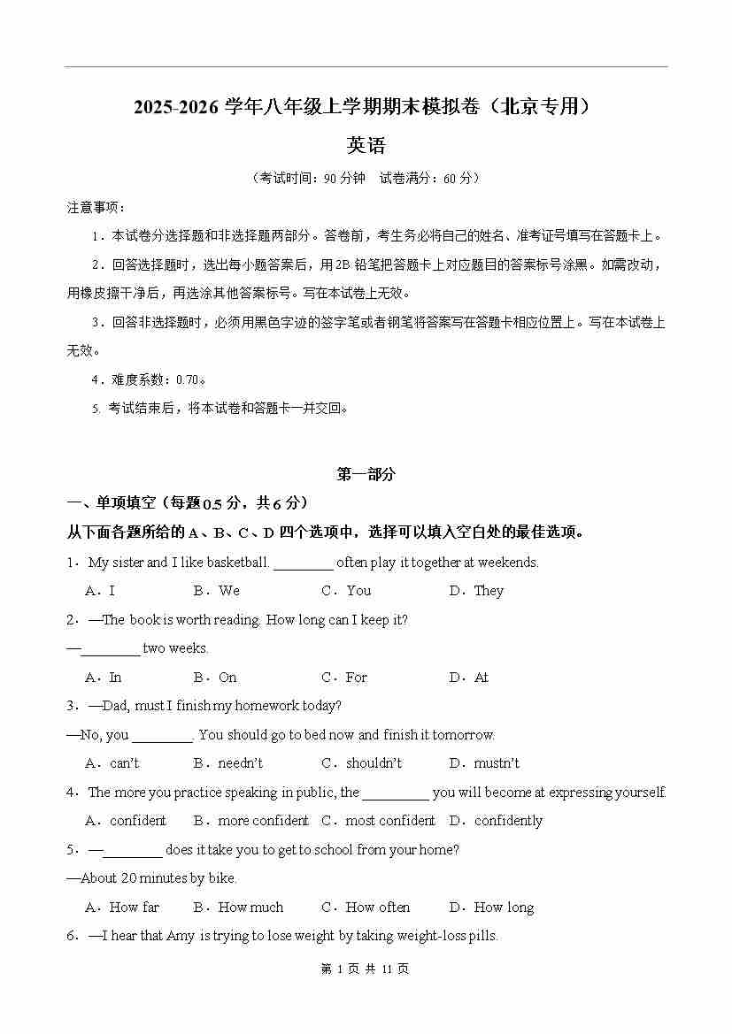 八年级英语期末模拟卷(考试版A4)(北京专用)