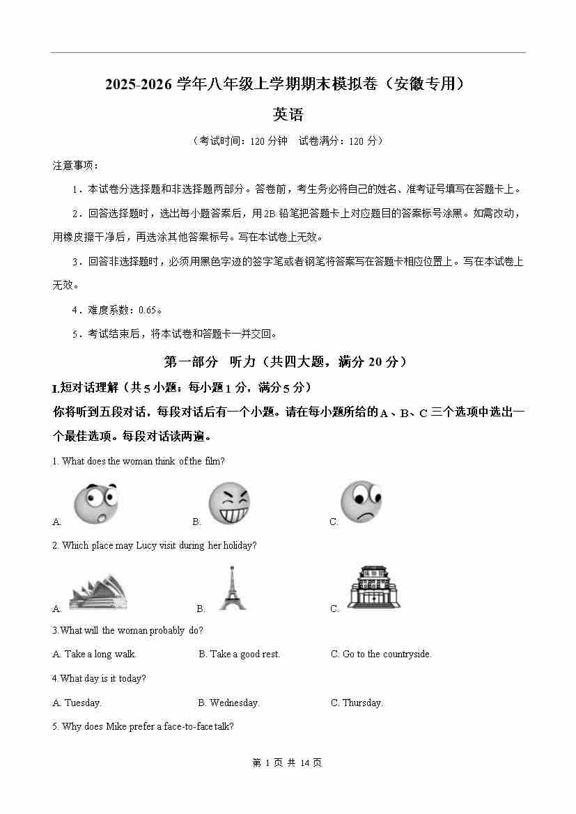 八年级英语期末模拟卷(考试版A4)(安徽专用)