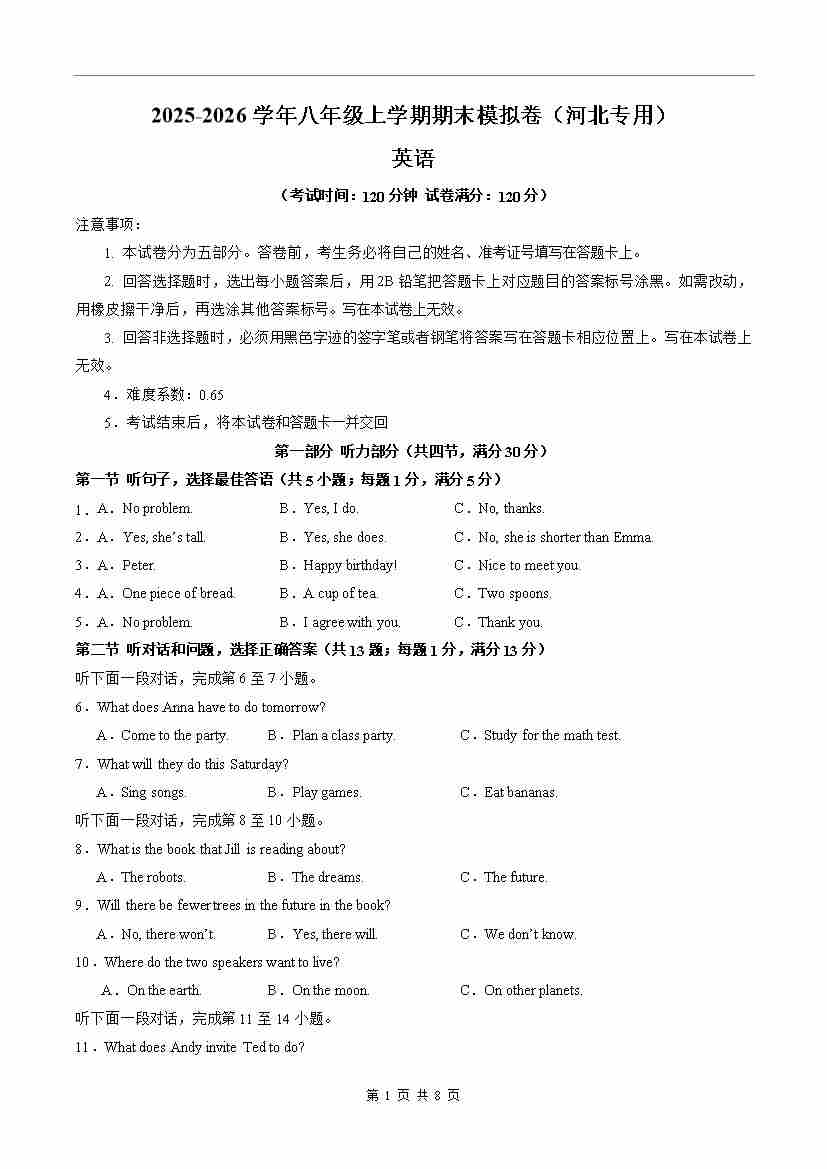八年级英语期末模拟卷(考试版A4)(河北专用)