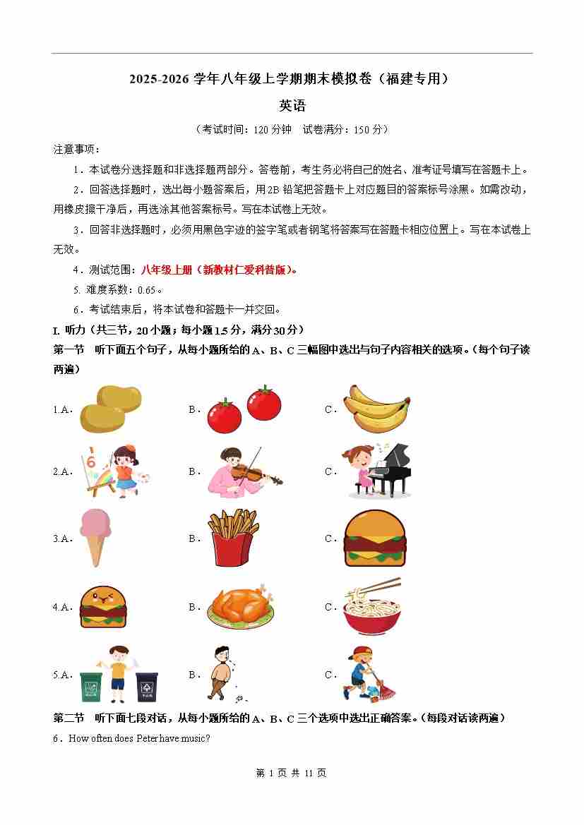 八年级英语期末模拟卷(考试版A4)(福建专用)
