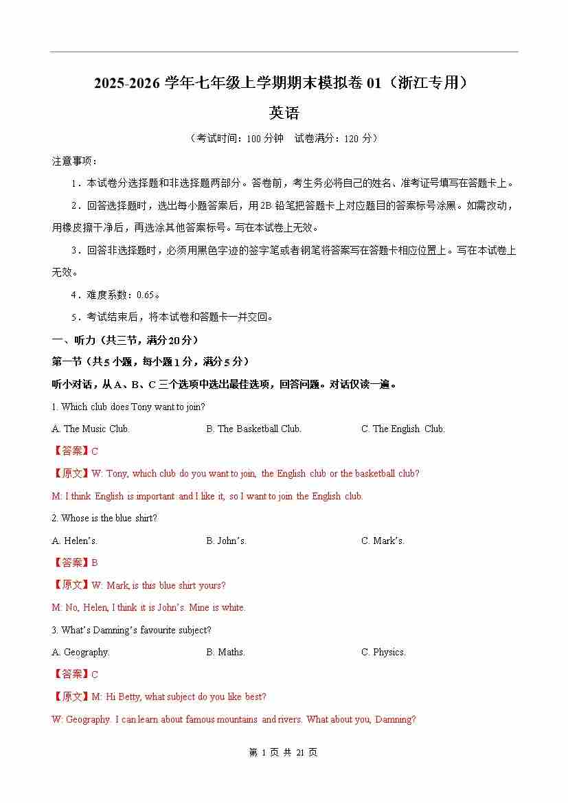 七年级英语期末模拟卷01(全解全析)(浙江专用)