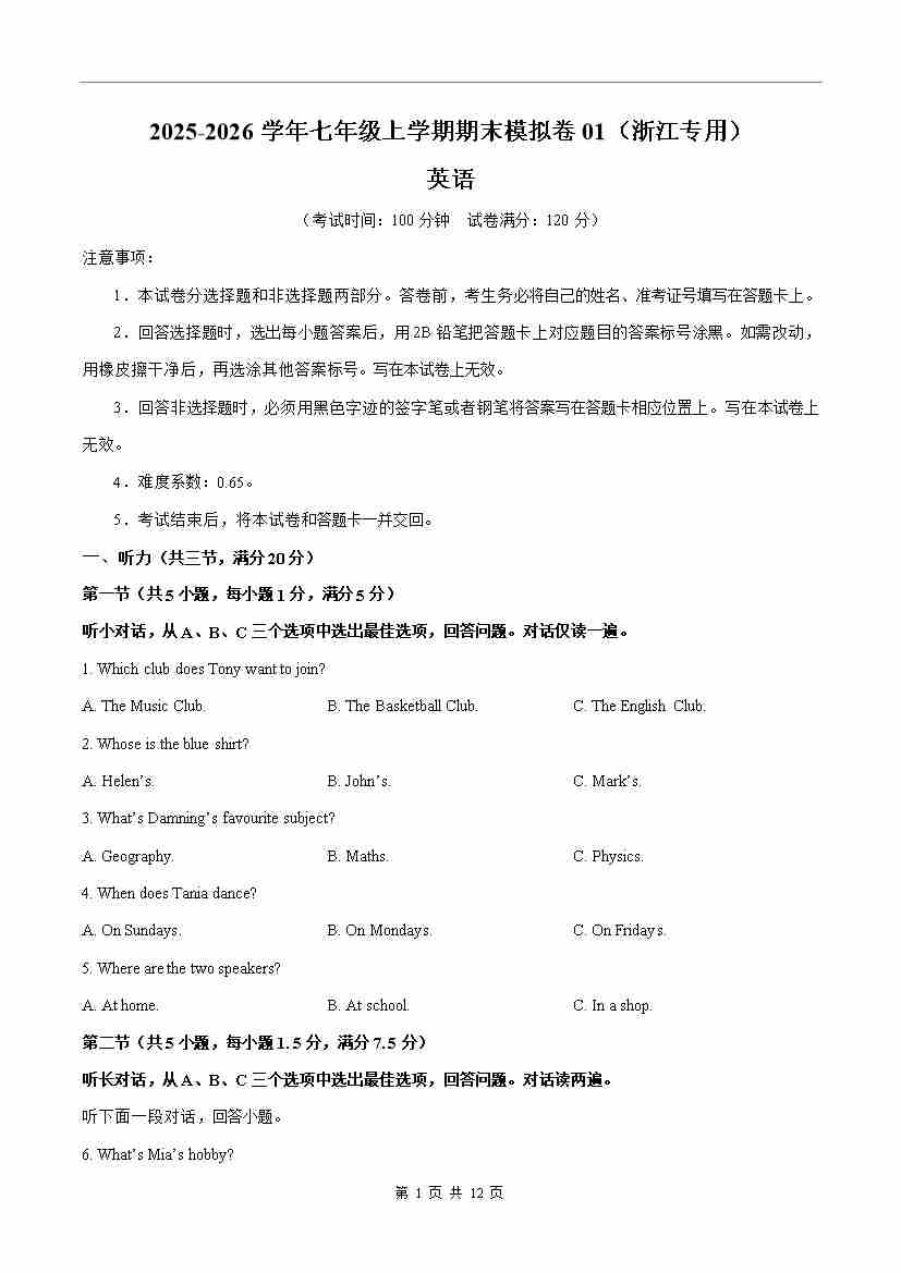 七年级英语期末模拟卷01(考试版A4)(浙江专用)