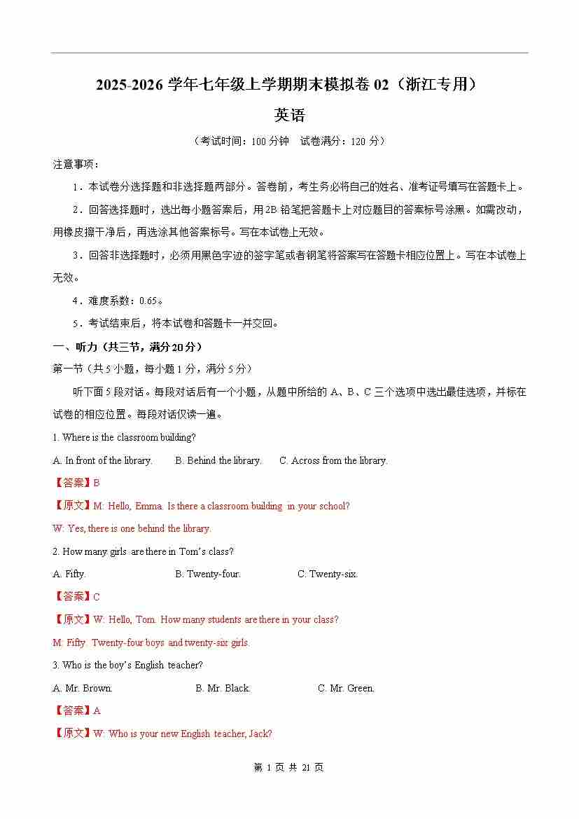 七年级英语期末模拟卷02(全解全析)(浙江专用)