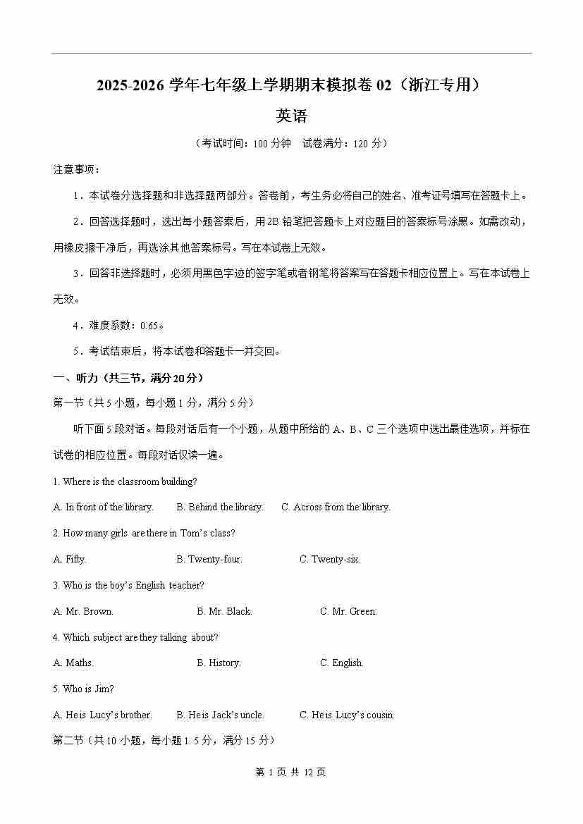 七年级英语期末模拟卷02(考试版A4)(浙江专用)
