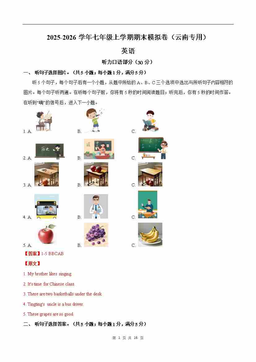七年级英语期末模拟卷(全解全析)(云南专用)