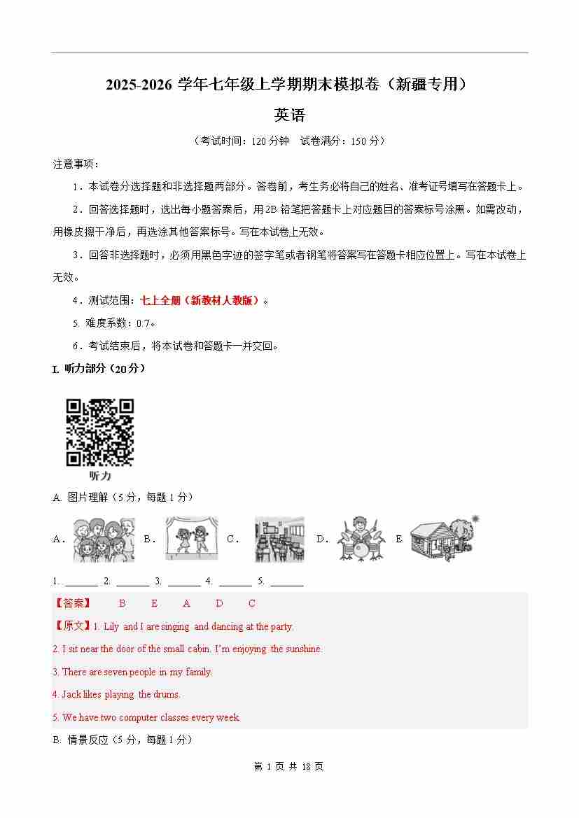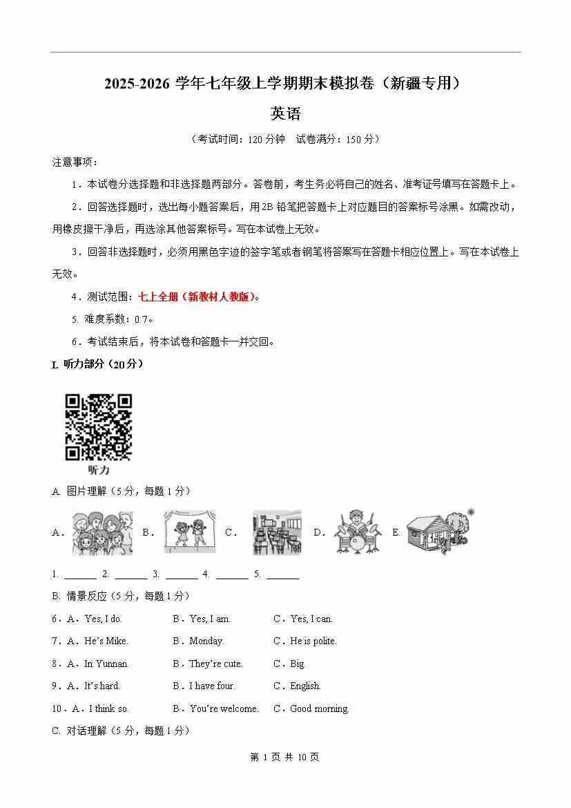 七年级英语期末模拟卷(考试版A4)【测试范围:七上全册】(新疆专用)