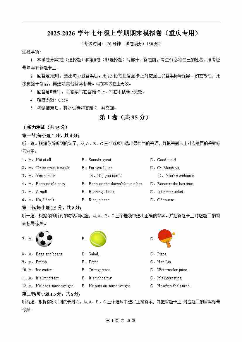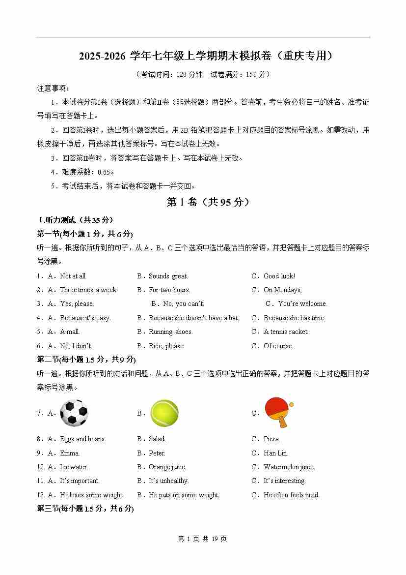 七年级英语期末模拟卷(考试版A4)(重庆专用)