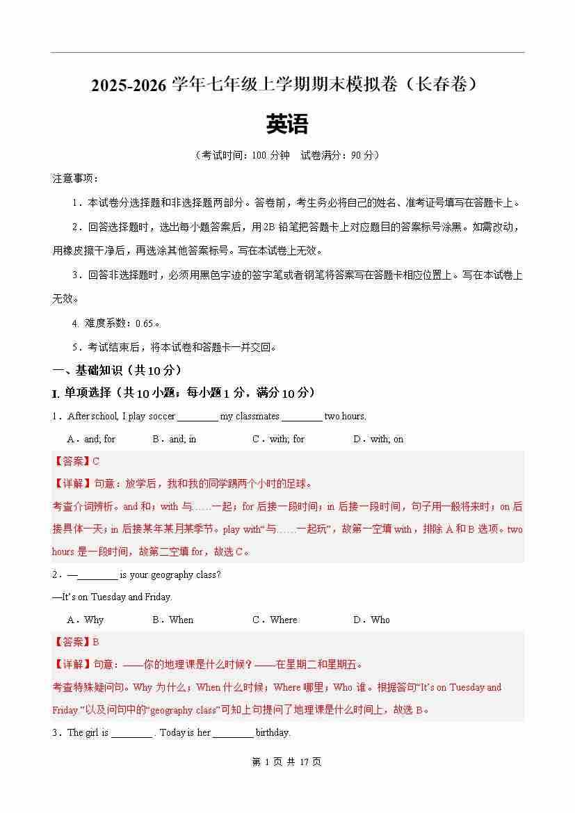 七年级英语期末模拟卷(全解全析)(长春专用)