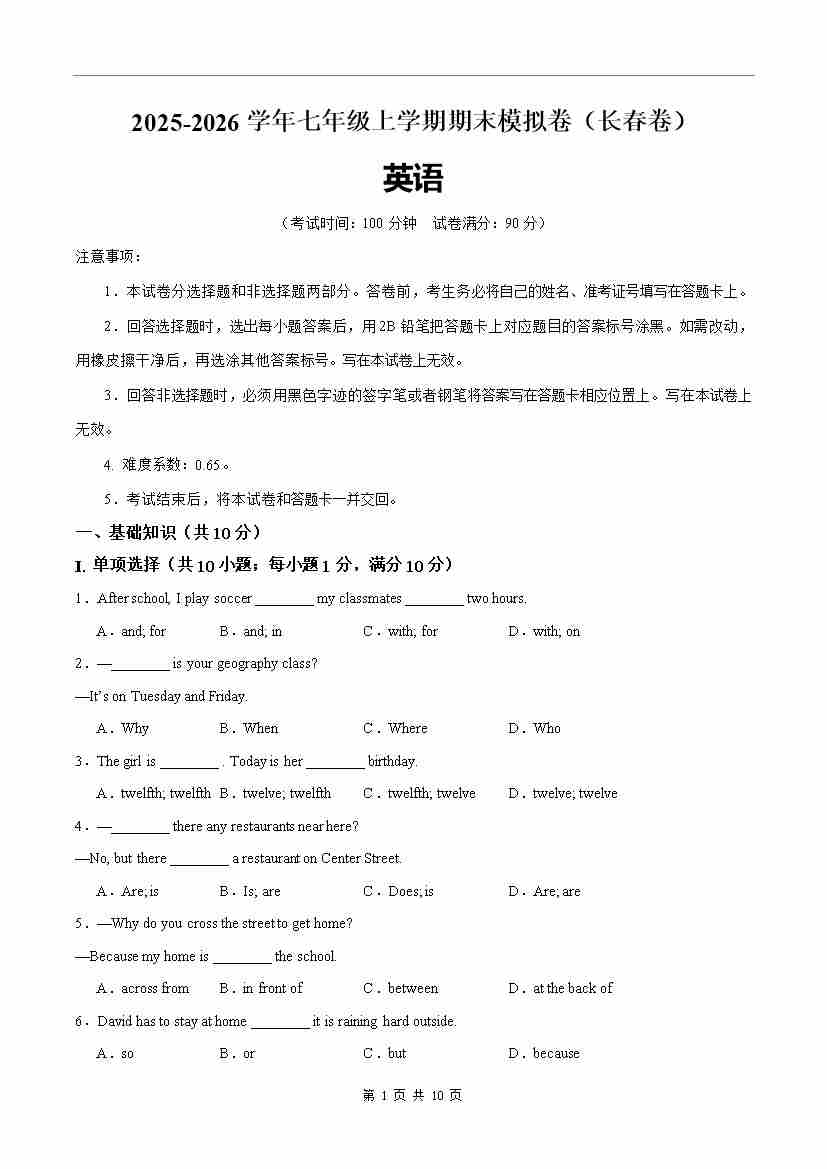 七年级英语期末模拟卷(考试版A4) (长春专用)