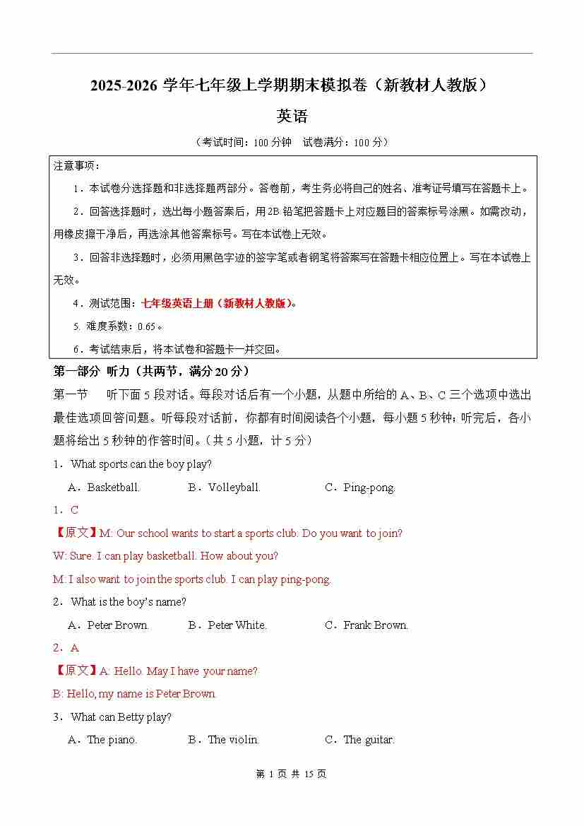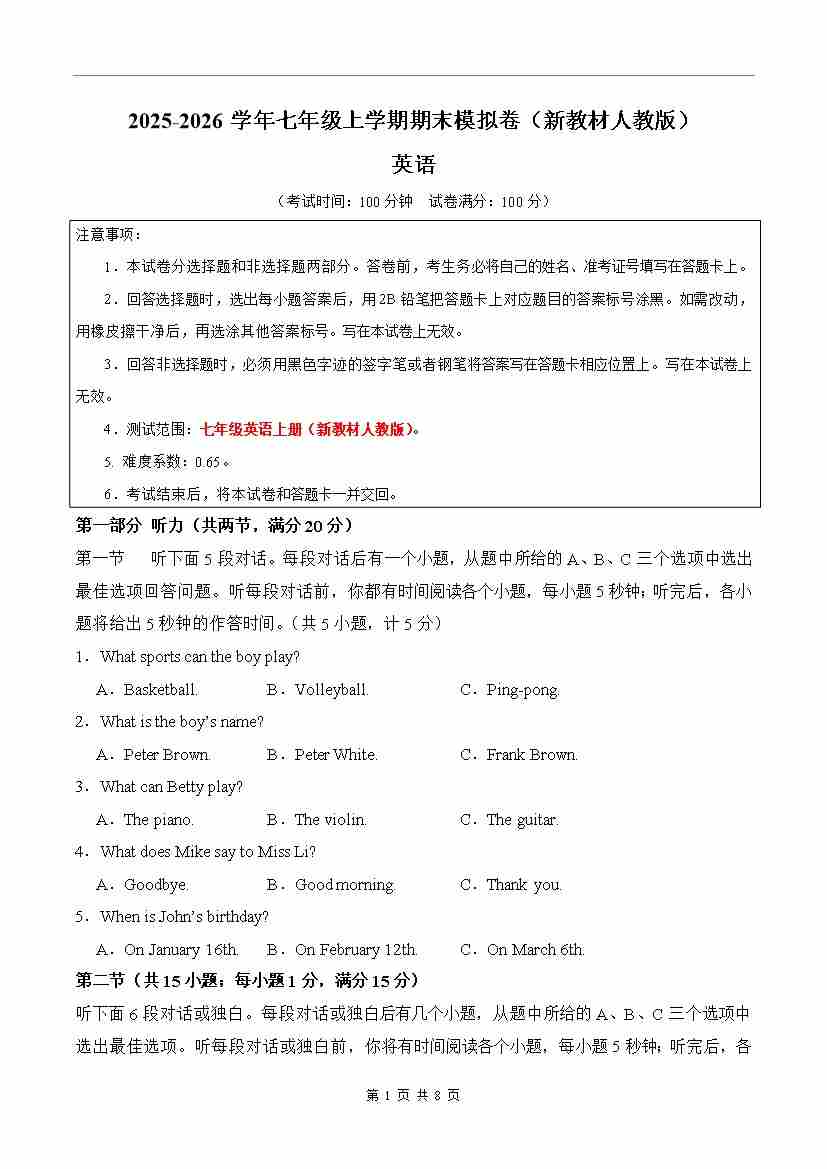 七年级英语期末模拟卷(考试版A4)【测试范围:七上全册】(新教材人教版)