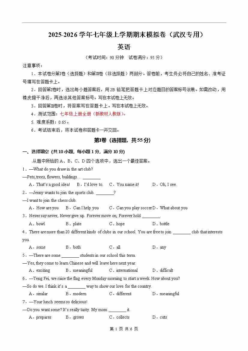 七年级英语期末模拟卷(考试版A4)【测试范围:七上全册】(武汉专用)