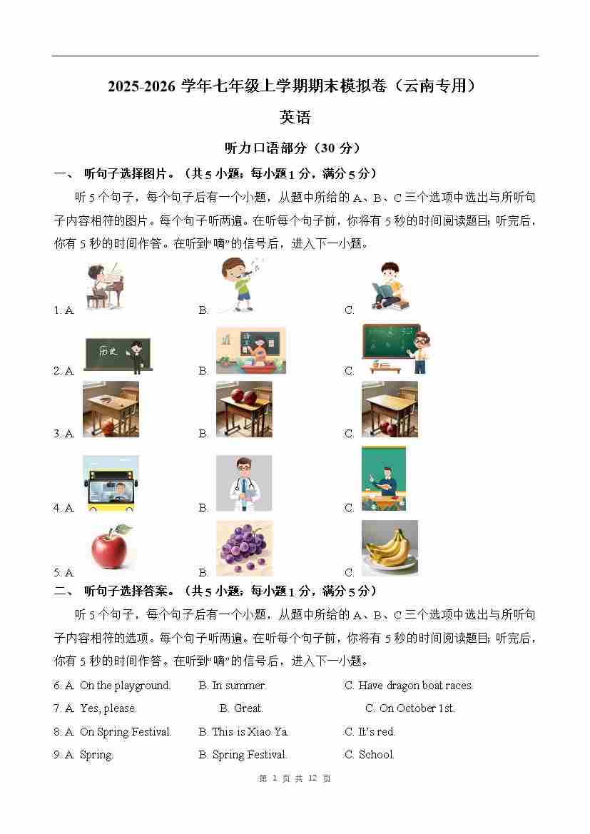 七年级英语期末模拟卷(考试版A4)(云南专用)
