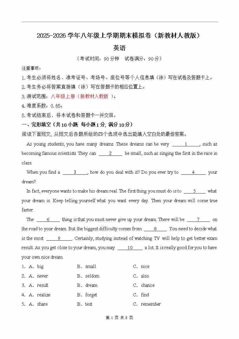 八年级英语期末模拟卷 (考试版A4)(兰州专用 新教材人教版)