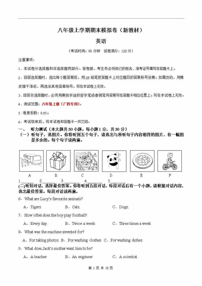 八年级英语期末模拟卷(考试版A4)(广西专用,新教材)