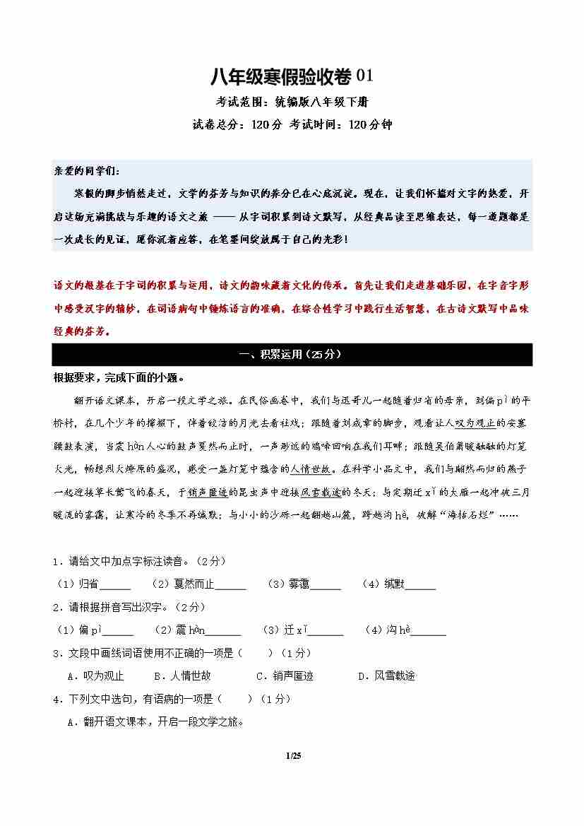 2026年寒假验收卷01(范围:统编版八年级下册)(解析版)