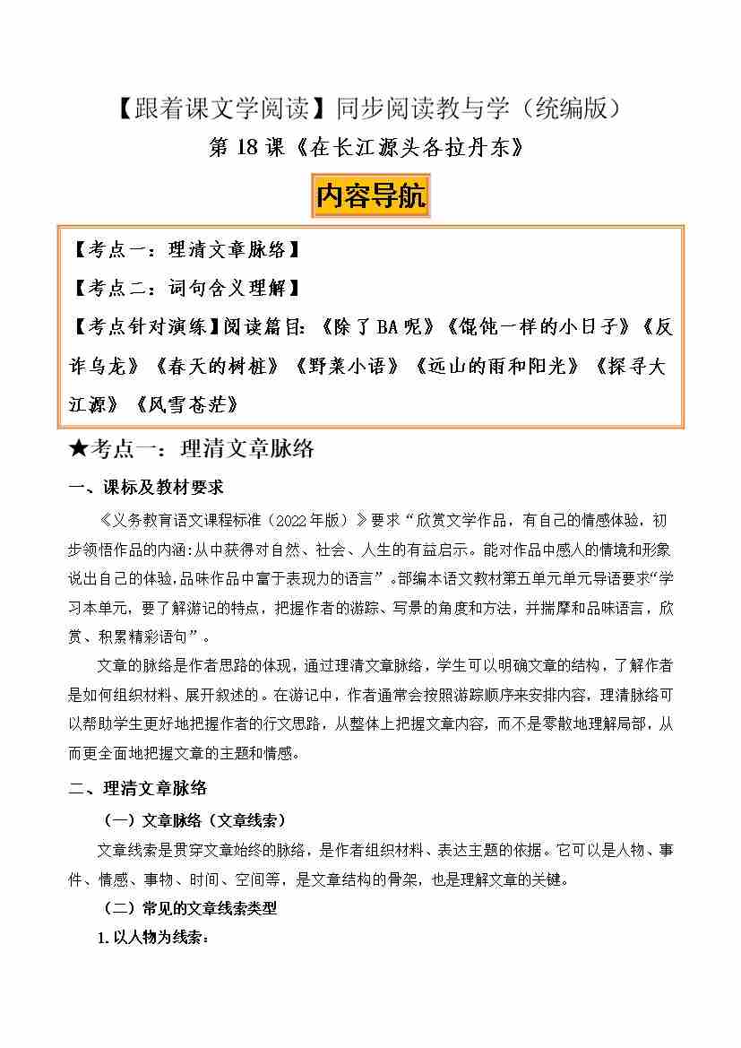 马丽华《在长江源头各拉丹东》:理清文章脉络、词句含义理解(解析版)