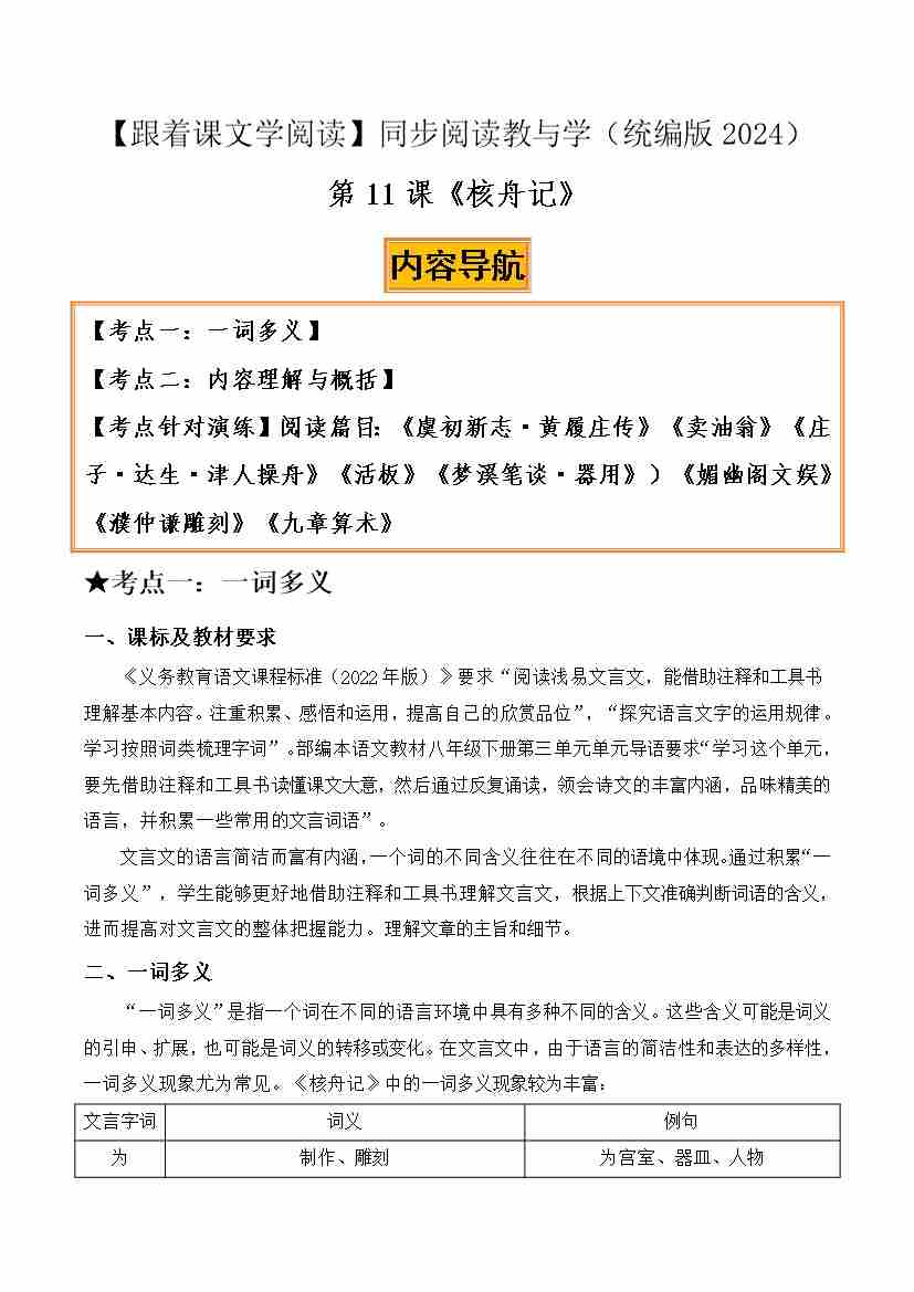魏学洢《核舟记》:一词多义、内容理解与概括(解析版)