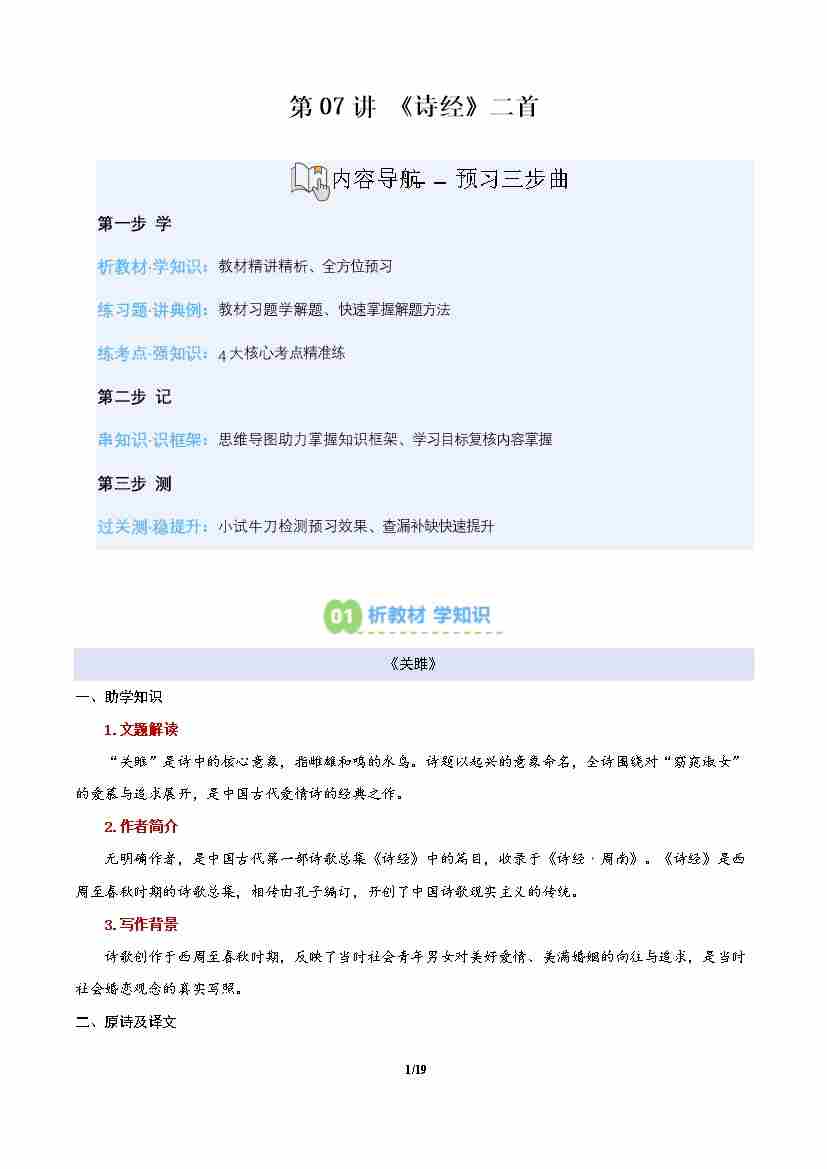 ②寒假预习-第07讲 《诗经》二首(寒假预习讲义)(学生版)-2026学年八年级语文寒假衔接讲练(统编版-新教材)