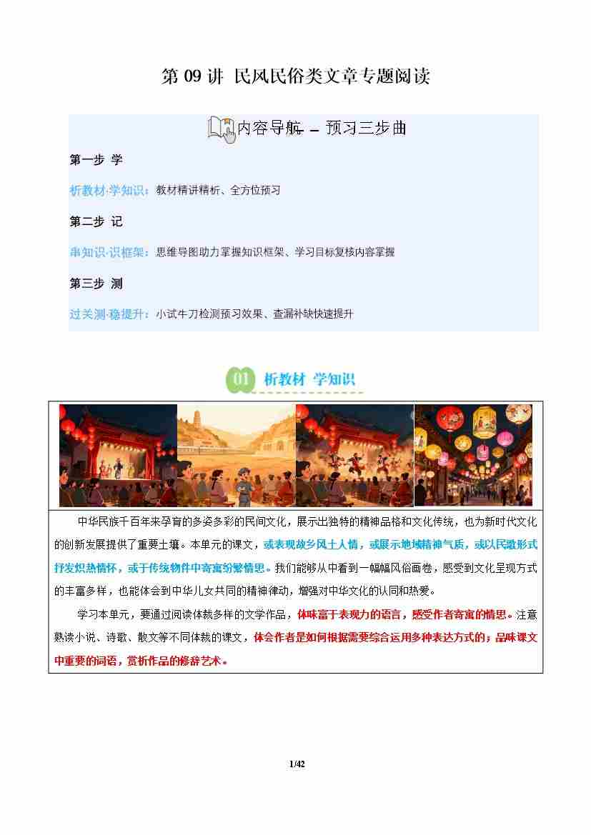 ②寒假预习-第09讲 民风民俗类文章专题阅读(寒假预习讲义)(学生版)-2026学年八年级语文寒假衔接讲练(统编版-新教材)